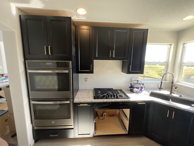 do not change the cabinets in any way preserve the exact cabinet colors materials finishes dimensions door and drawer styles hardware spacing alignment and all geometry exactly as shown do not alter the countertop shape backsplash appliances flooring lighting fixtures or wall structure only remove the construction materials clutter and mess from the scene clean the room and make it look finished and staged add a few simple tasteful home accessories appropriate for the style of the space but do not add or remove any furniture windows or architectural elements maintain the original lighting direction and realism enhance clarity and polish the photo while keeping the cabinetry and room design completely unchanged do not alter the lighting to keep the cabinet colors as they are in the image change the countertops to a white and brown marble add new crown molding to the cabinets add a simple view out the windows put an oven below the cooktop