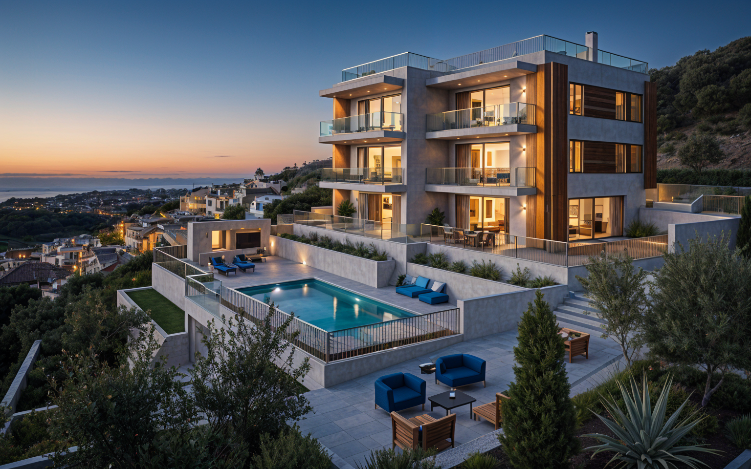 contemporary night shot medireranean countryside background olive trees and aloe veras and thujas in garden french interiors in windows brass vertical stripes railings rolf benz furniture brass window frames white facade grey pieces of facade change to brass white marble pavement shining blue mosaic pool in front of every balcony two randomly distributed floor to floor vertical striped brass panels 80 by 320 cm architecture