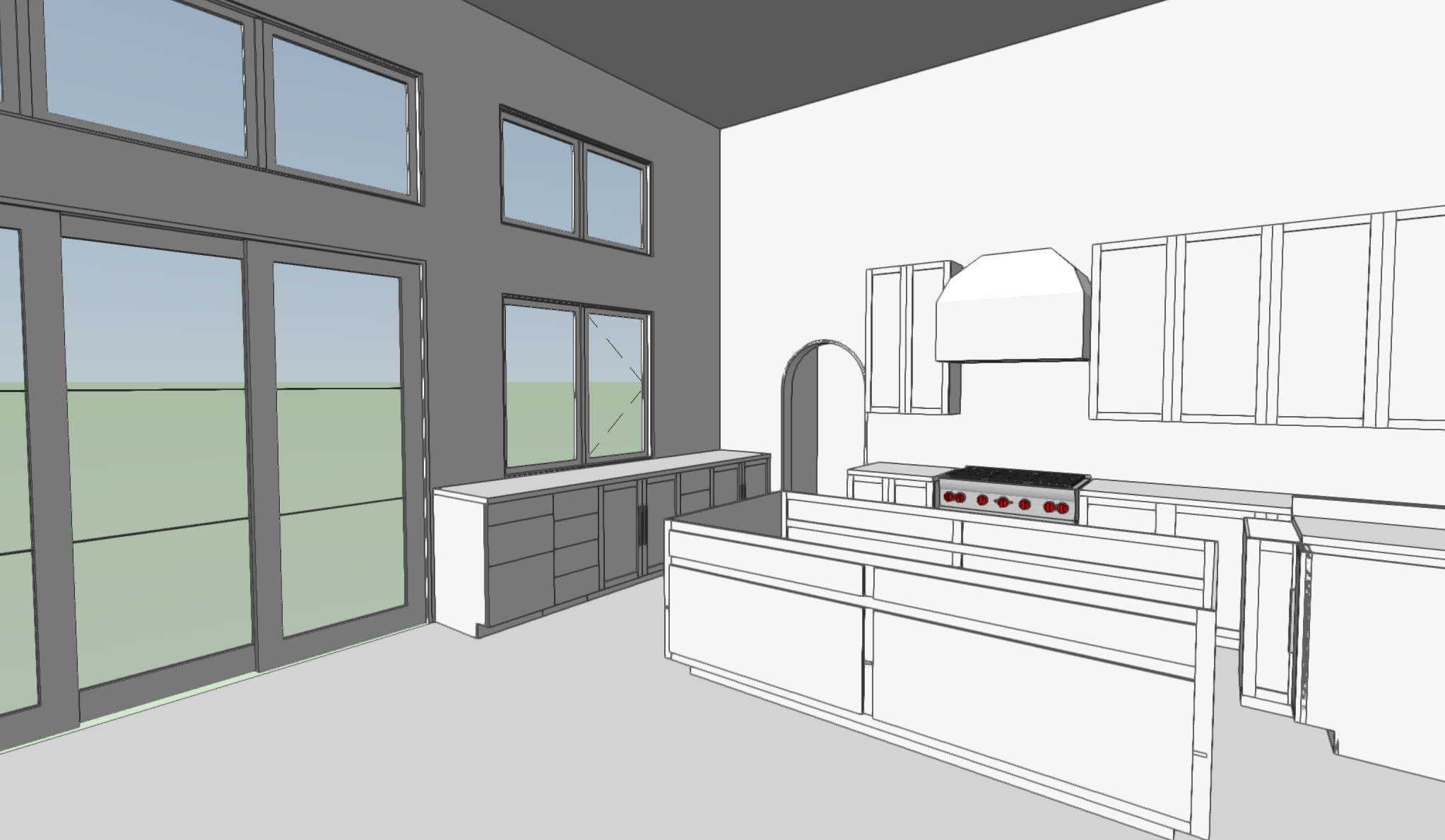render a modern kitchen with a high ceiling and large windows use soft natural lighting to create a welcoming atmosphere paint the walls in warm white and the ceiling in a light grey use sleek stainless steel for kitchen appliances and fixtures choose deep espresso brown for the cabinets and island with a polished marble countertop in a subtle white and grey pattern set the floor in light oak wood use matte black for the window and door frames outside depict a lush green landscape capture a sense of elegance and tranquility