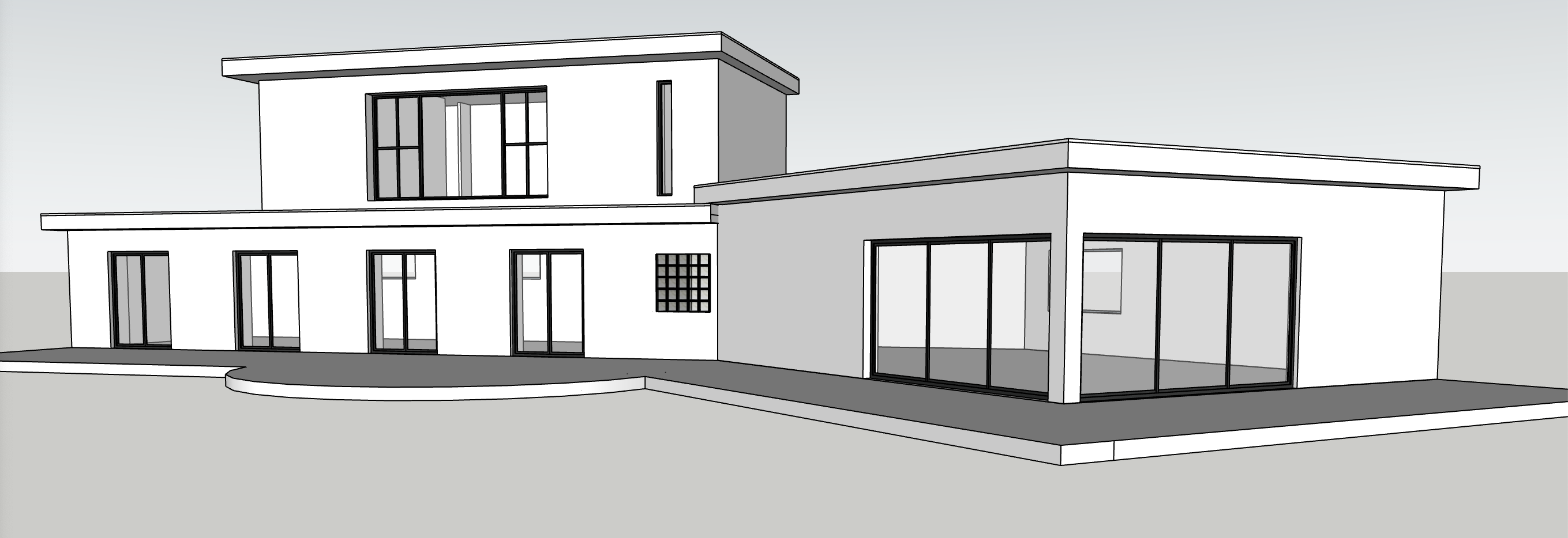rendu cr pis blanc sur l ensemble de la maison type calofornienne terrasse en bois a l arri re de la maison foret de ch ne de sapin et de h tre dense