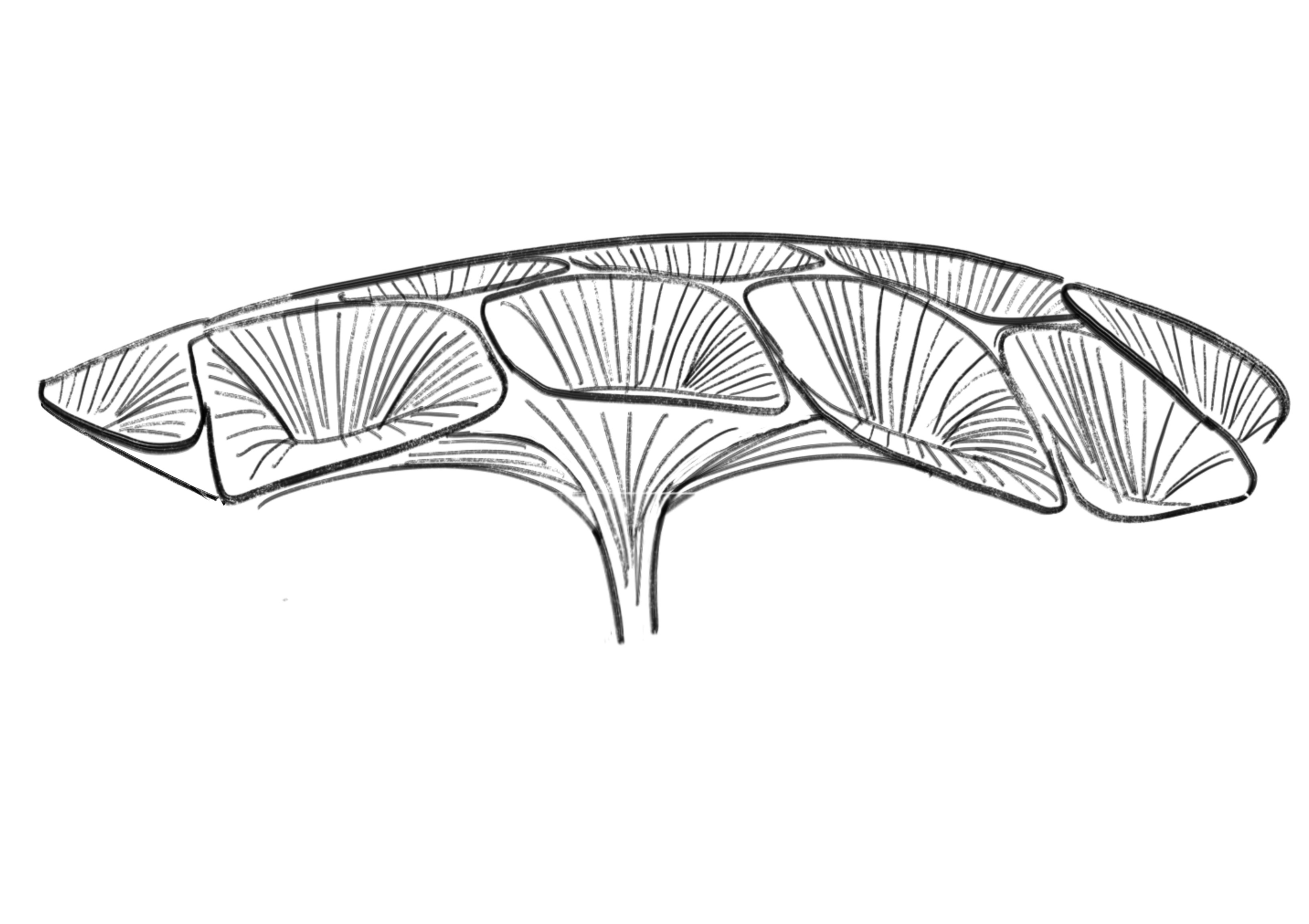 night shot a large organic interactive facade of mushroom pods and lights where lights respond to human touch through color ful patterns cyberpunk night human silhouette in front