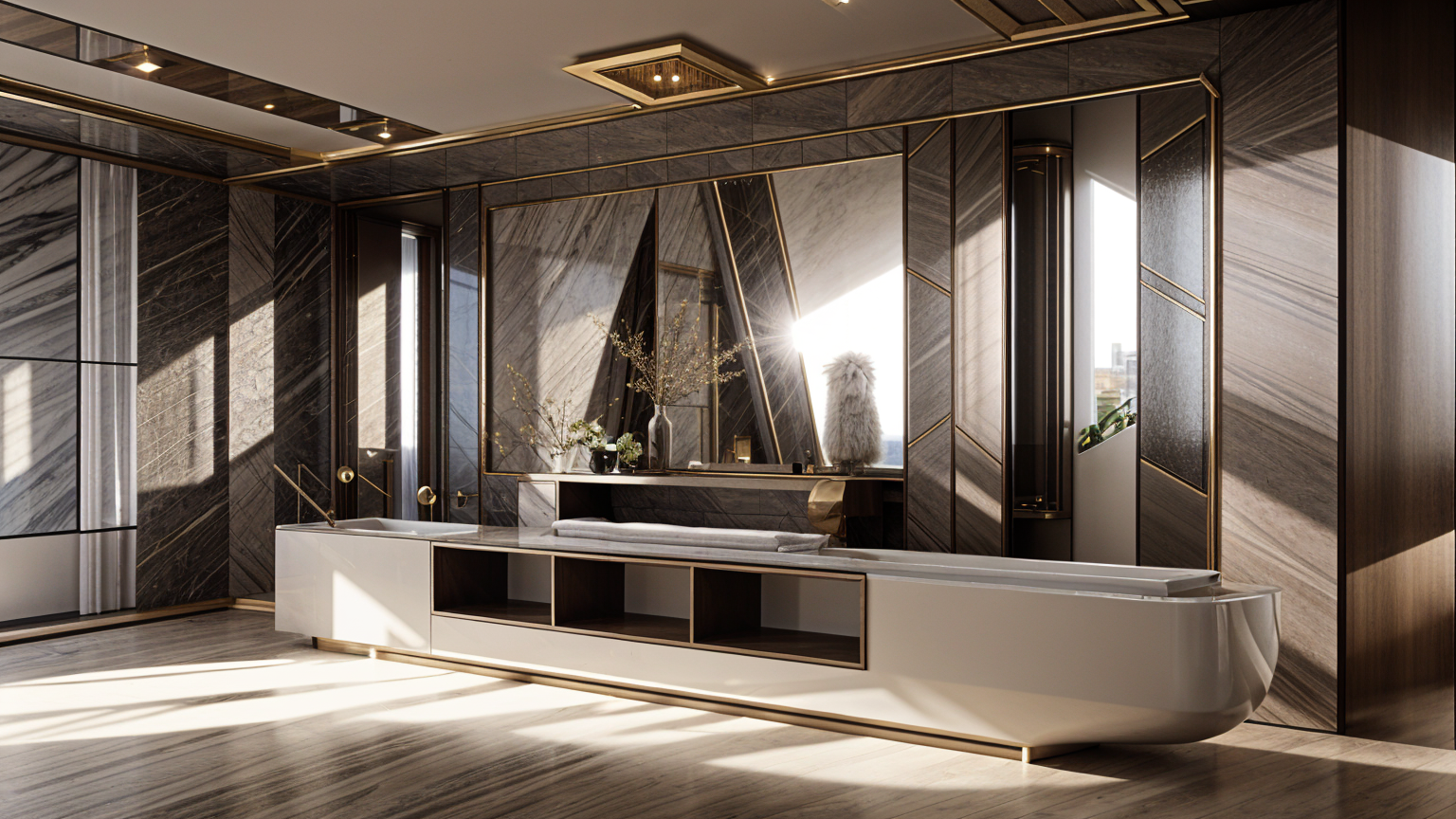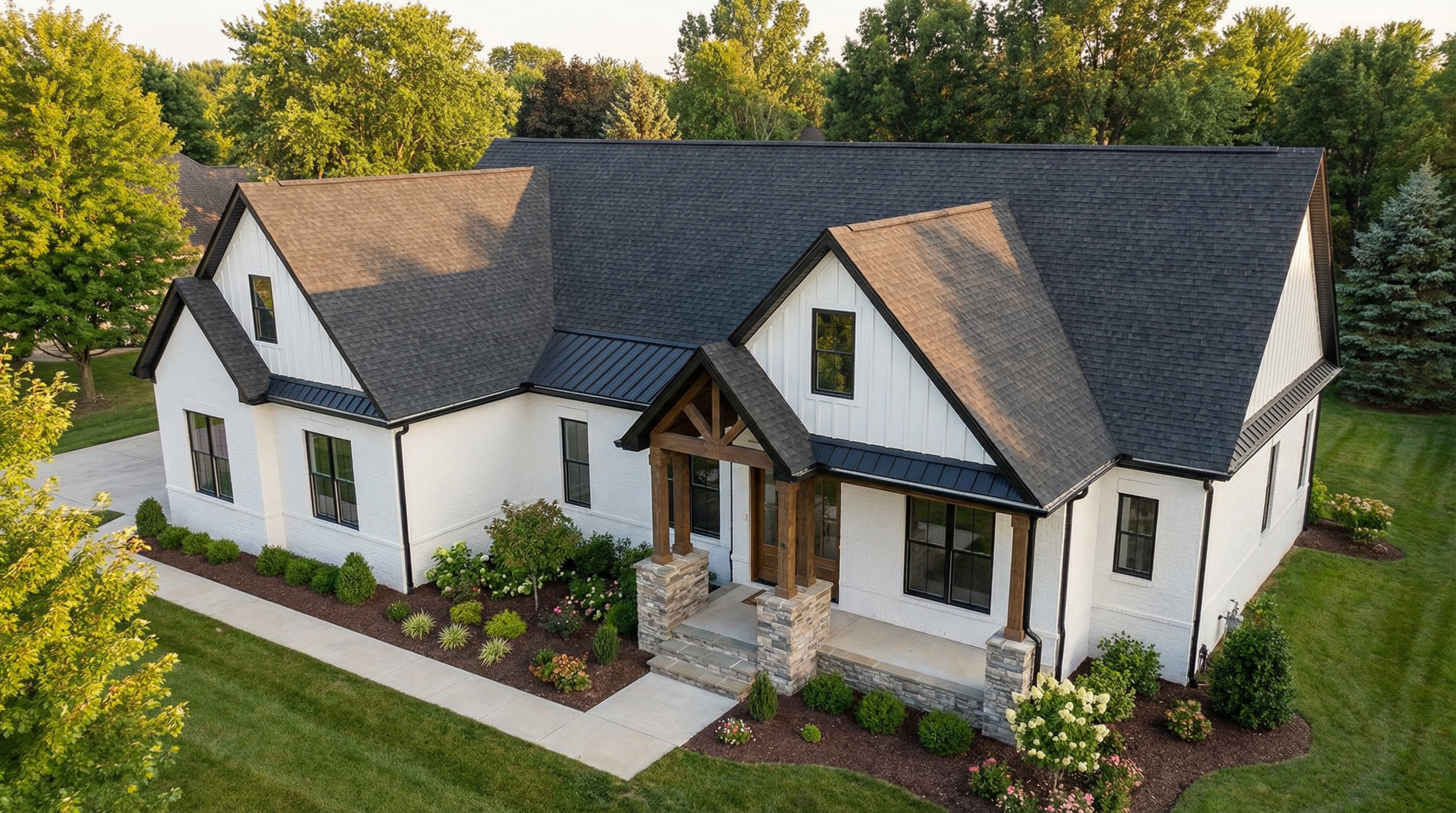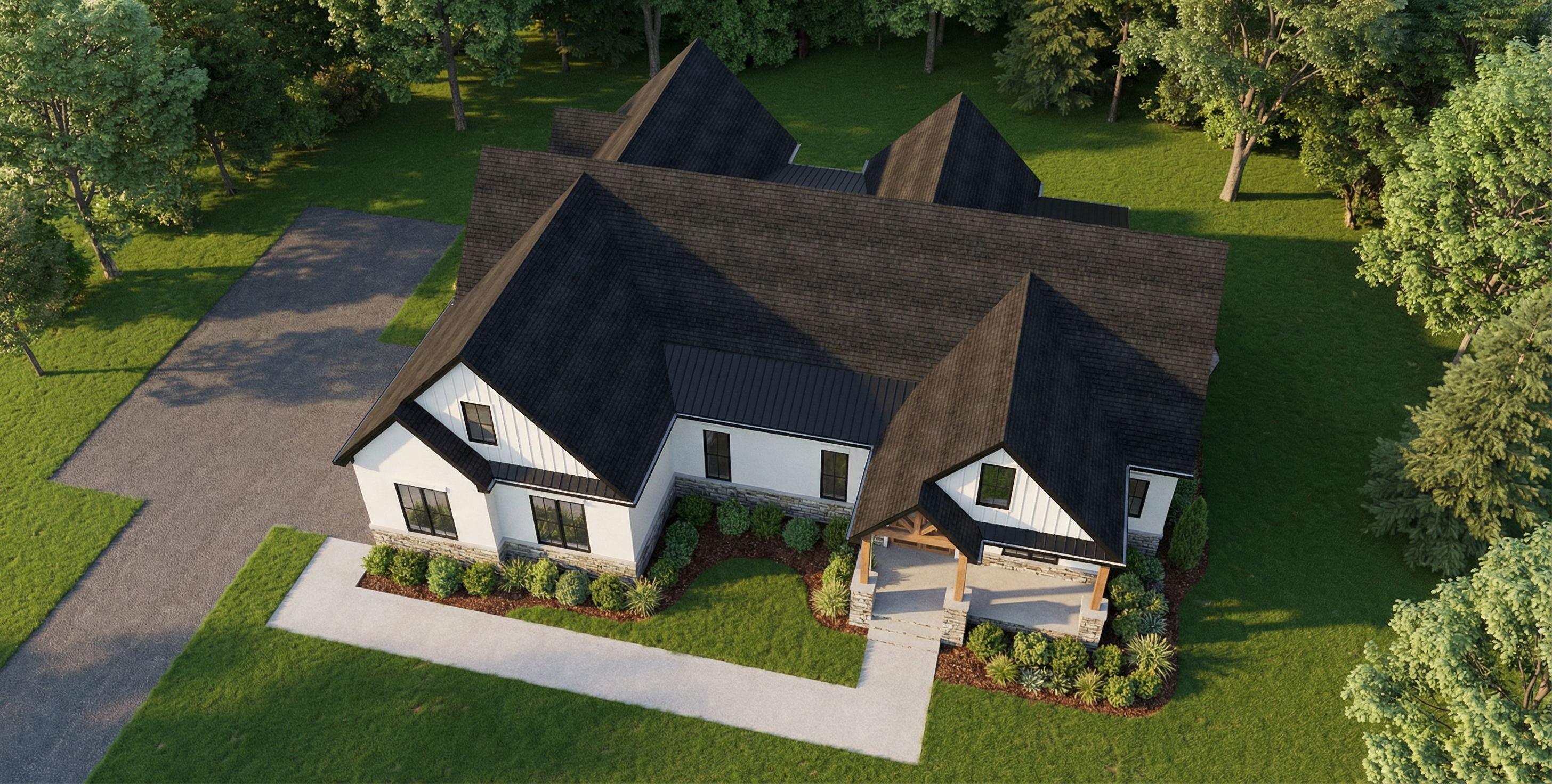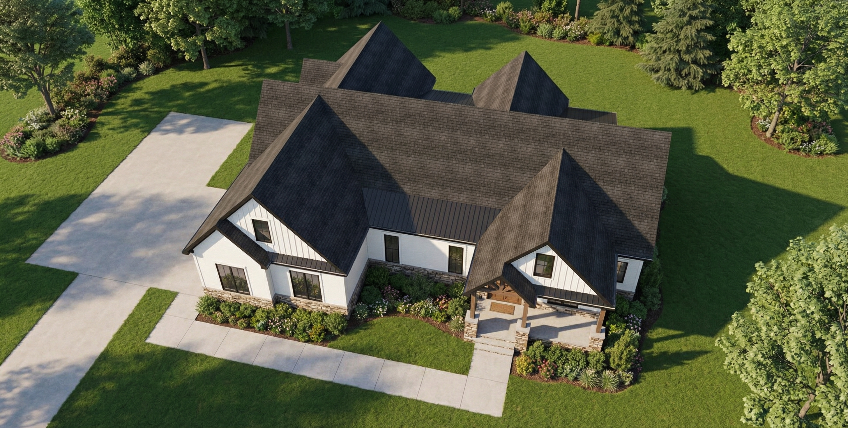 afternoon sunlight add clumps or groupings of california native plants and flowers to the yard areas with grass in between enhance the waterfall effect at the infinity edge of the swimming pool along the full length of the pool add a 2025 model vw buzz parked in the driveway on the left side make the entire driveway surface grasscrete with an asphalt road at the bottom of it with a concrete drainage trough at the bottom of the driveway add some random weeds in the grasscrete and tire tracks from cars add 3 children playing with a soccer ball on the lawn above the garage add people around the pool and swimming in the pool add one man and one woman walking up the stairs on the right side of the garage add groupings of bushes and trees to the adjacent landscape like the area around malibu lake with wild grasses in between add a man and a woman looking out from the center of the balcony at the upper level of the house enhance roadway at the upper level of the view to make it look more realistic make it one lane wide partially obscure it with bushes and trees open up the right side garage door and add an orange colored 1972 porsche 911 parked halfway inside the garage add 2 men on the driveway talking to each other with a medium sized dog sitting next to them add a small modest sized ranch style modern home with a low pitched metal roof on the adjacent parcel on the far left side of the view and partially obscure it with trees and plants and a little fog the planter along the outer edge of the garage walls keep the type of grass that is already in the view add a man and woman sitting facing the fire pit on the right sofa add some weathering effect to the 6 wide board formed concrete material of the garage walls and other retaining walls add a fog effect to the right side of the view on the adjacent parcel use the original image vertical 4 wood siding as a reference and enhance the look of the material keep the lawn area at the pool level and the two trees from the source image at the right side original image the house has a dark gray standing seam metal roof add some light inside the house add a pickup truckdriving on the road at the top of the view