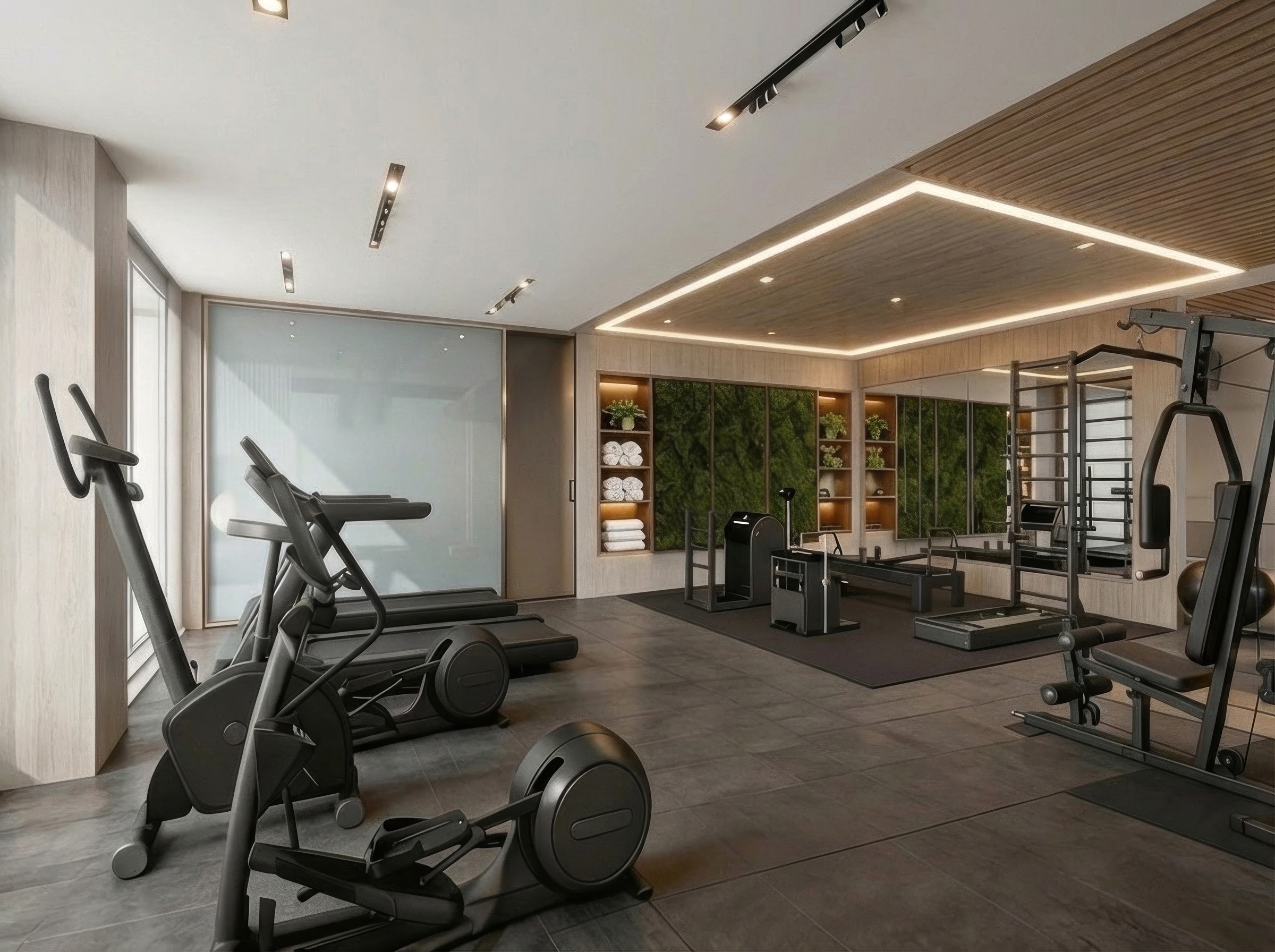 make all wood ceiling slats uniform on the right side of the gym ensure same direction same spacing same thickness and same color throughout slats must run in one continuous direction with no variation use warm taupe wood tone matte finish consistent across all panels do not change ceiling layout lighting or boundaries keep everything else exactly as is