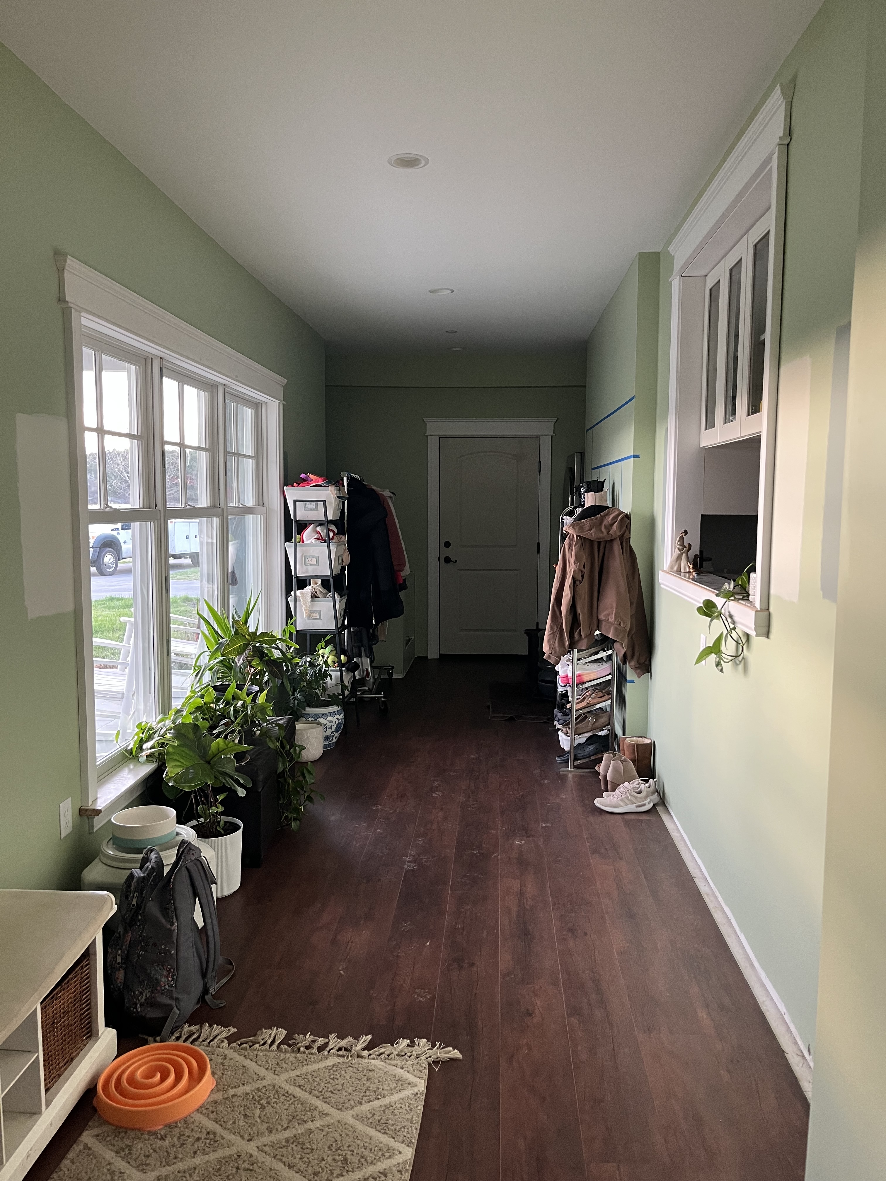 exterior shot add off white cabinetry where blue tape is on right side of wall door and trim to be darker paint color wallpaper only on back wall