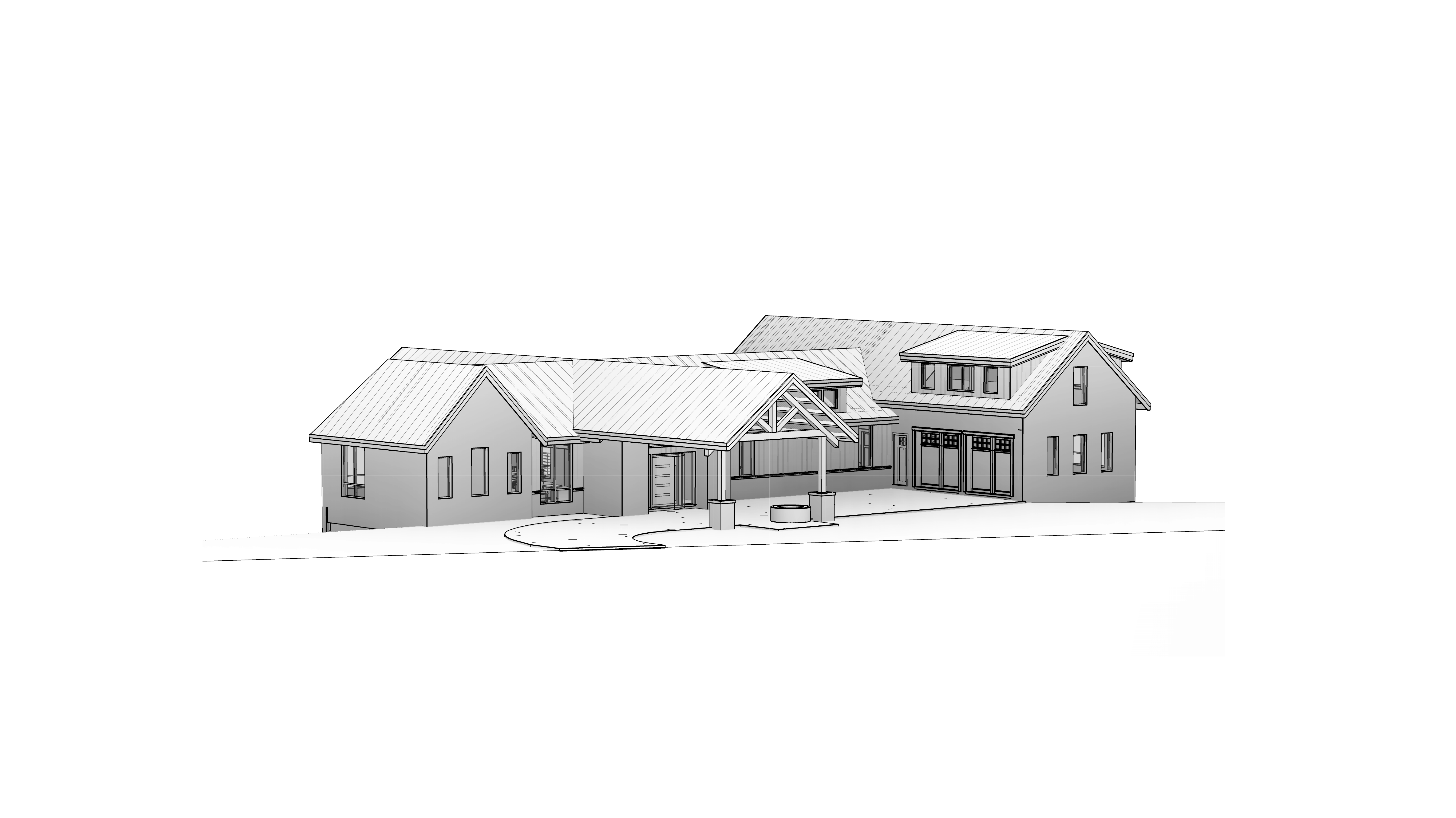 front view of a clean rustic architectural exterior rendered in cinematic vibrant golden hour lighting with blue skies mountain modern with heavy timber architectural style dark but warm wood siding beautifully lush green manicured landscape around structure with hedges and gardens black standing seam metal roof prominent cinematic lake in the far distance with big douglas fir trees surrounding the house in the background with this house above the lake high fidelity photorealistic visualization crisp shadow falloff refined facade geometry soft atmospheric depth premium architectural photography mood ultra clean composition and materials dark trim around windows