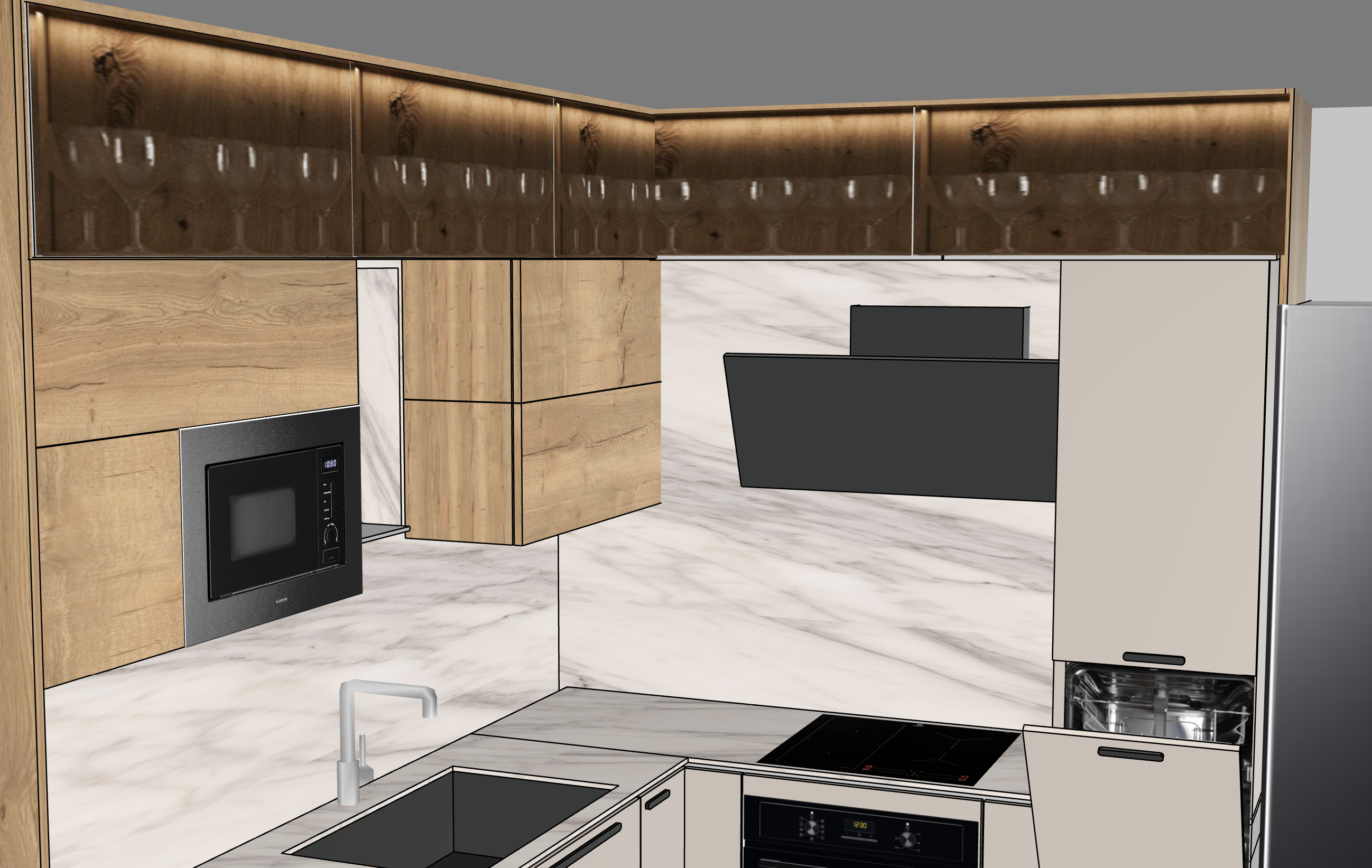 create a modern kitchen interior with a cozy and inviting atmosphere use warm wood tones for the upper and side cabinets a rich walnut texture the walls and countertops should feature a smooth white marble with subtle gray veining add a sleek stainless steel oven and a matte black exhaust hood for contrast include a modern minimalist silver faucet above the sink ensure the lighting is soft and ambient highlighting the textures and adding warmth to the overall scene