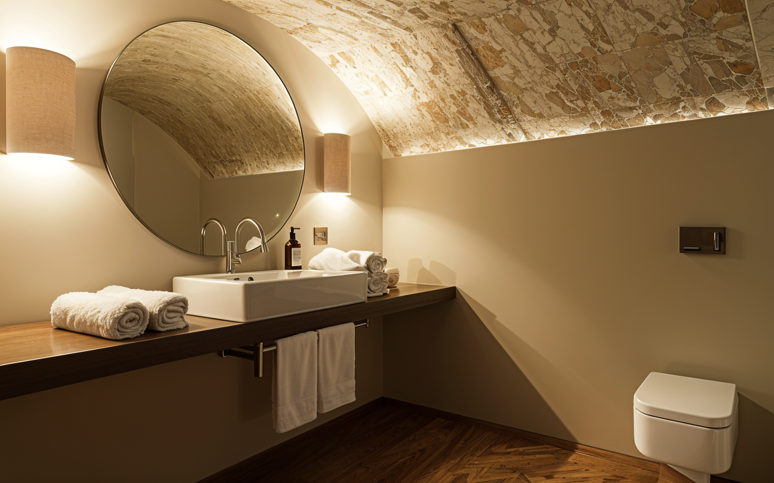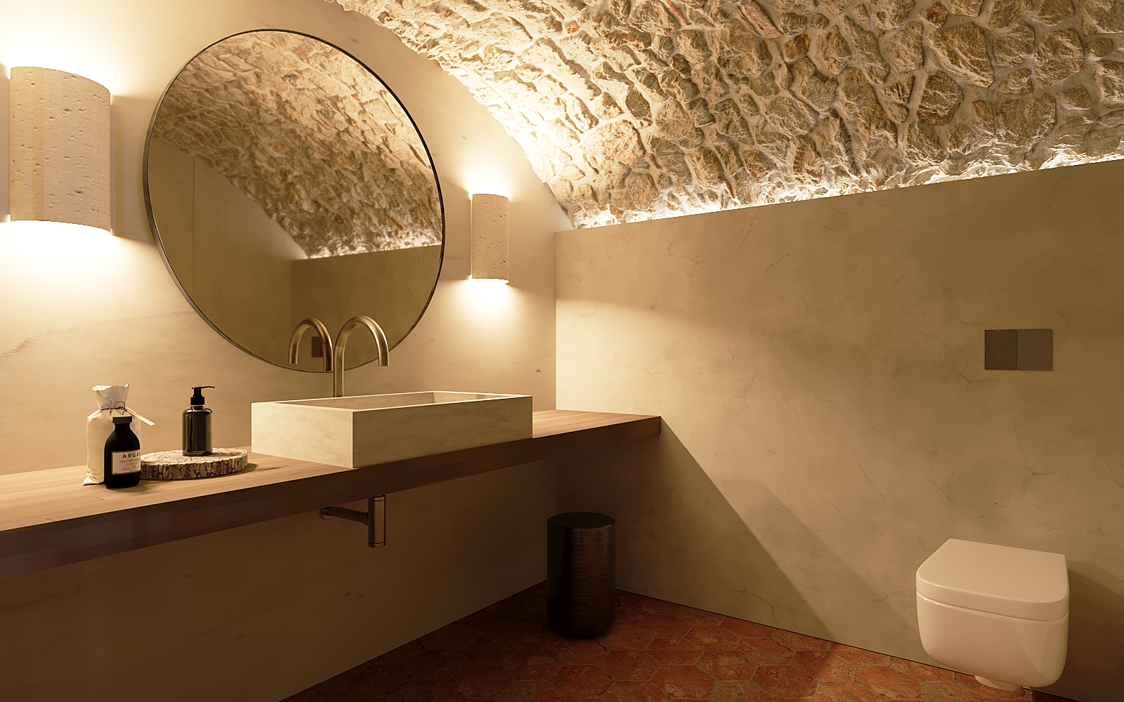 keep every detail i put make it look realistic wabi sabi style guest bathroom in a nice restaurant keep the nice tones and the objects that are in add 2 rolled towels next to the sink to make it look good no towel holder no towel on the toilet seat no plant make the general atmosphere very pretty and satisfying