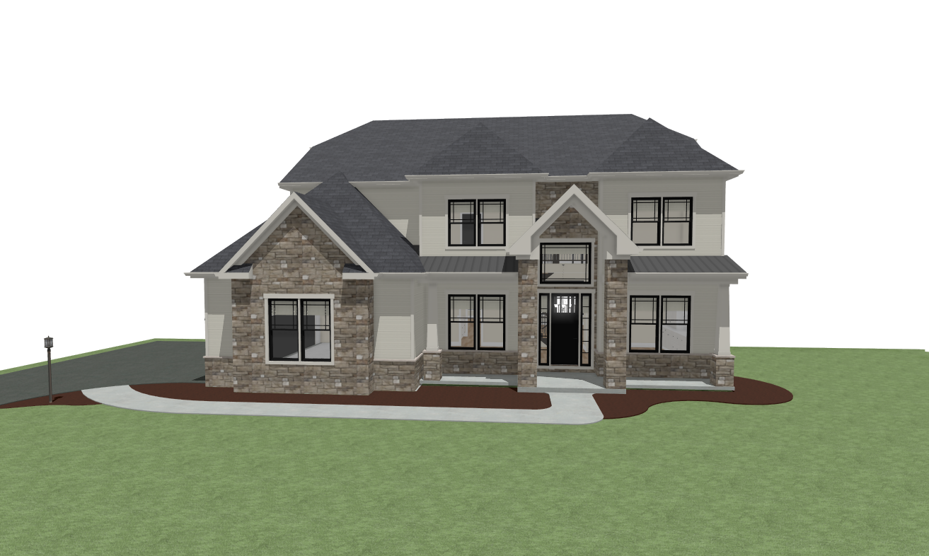 render this 3d image to appear photo realistic maintain all existing architectural materials and structural elements exactly as shown enhance the setting with a lush well maintained landscape include minimal beds manicured shrubs and a tree lined backdrop that frames the home naturally the windows should have a glossy finish with clear reflections of the surrounding trees and sky lighting should feel natural with soft shadows and realistic depth to bring the scene to life