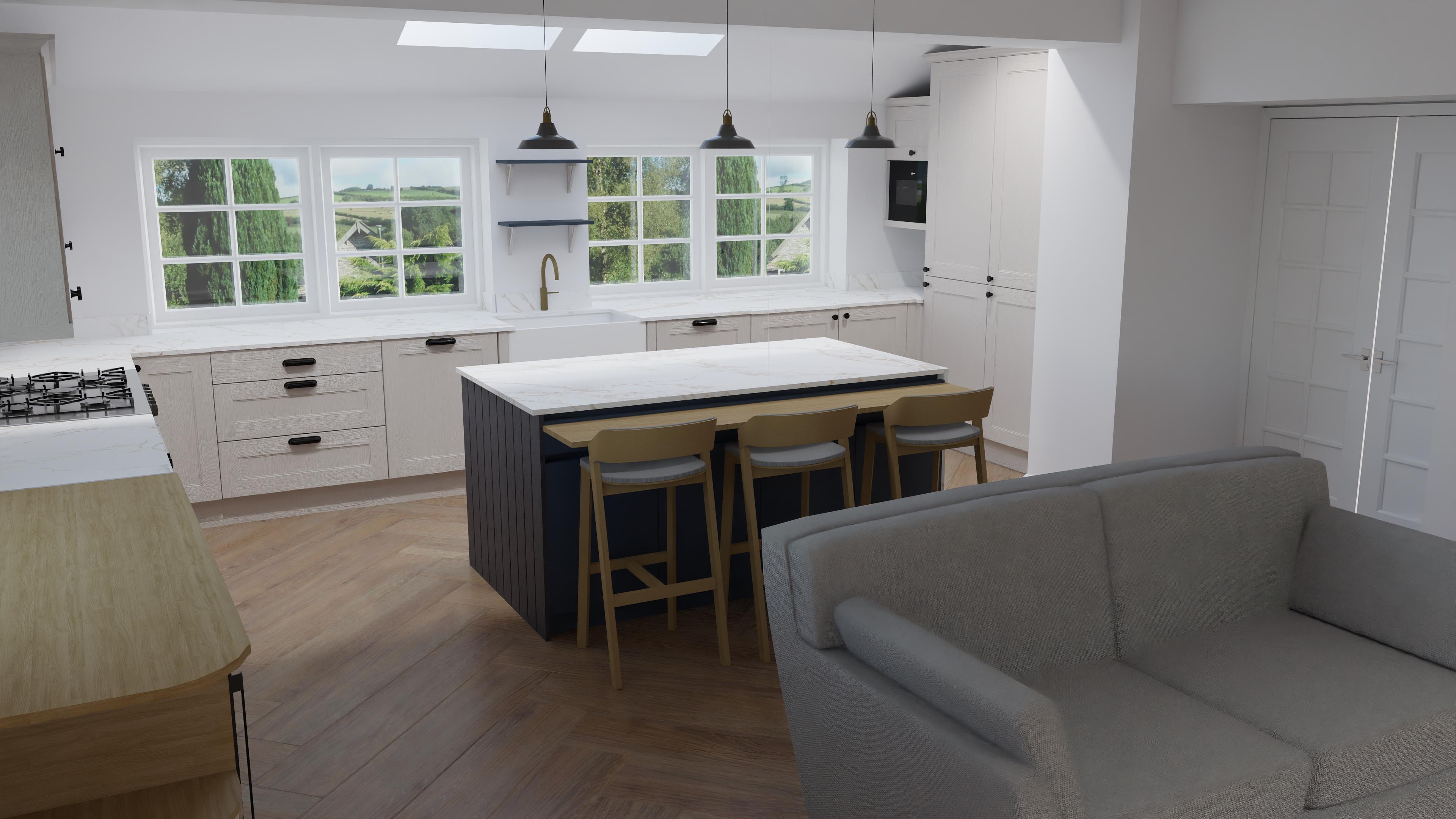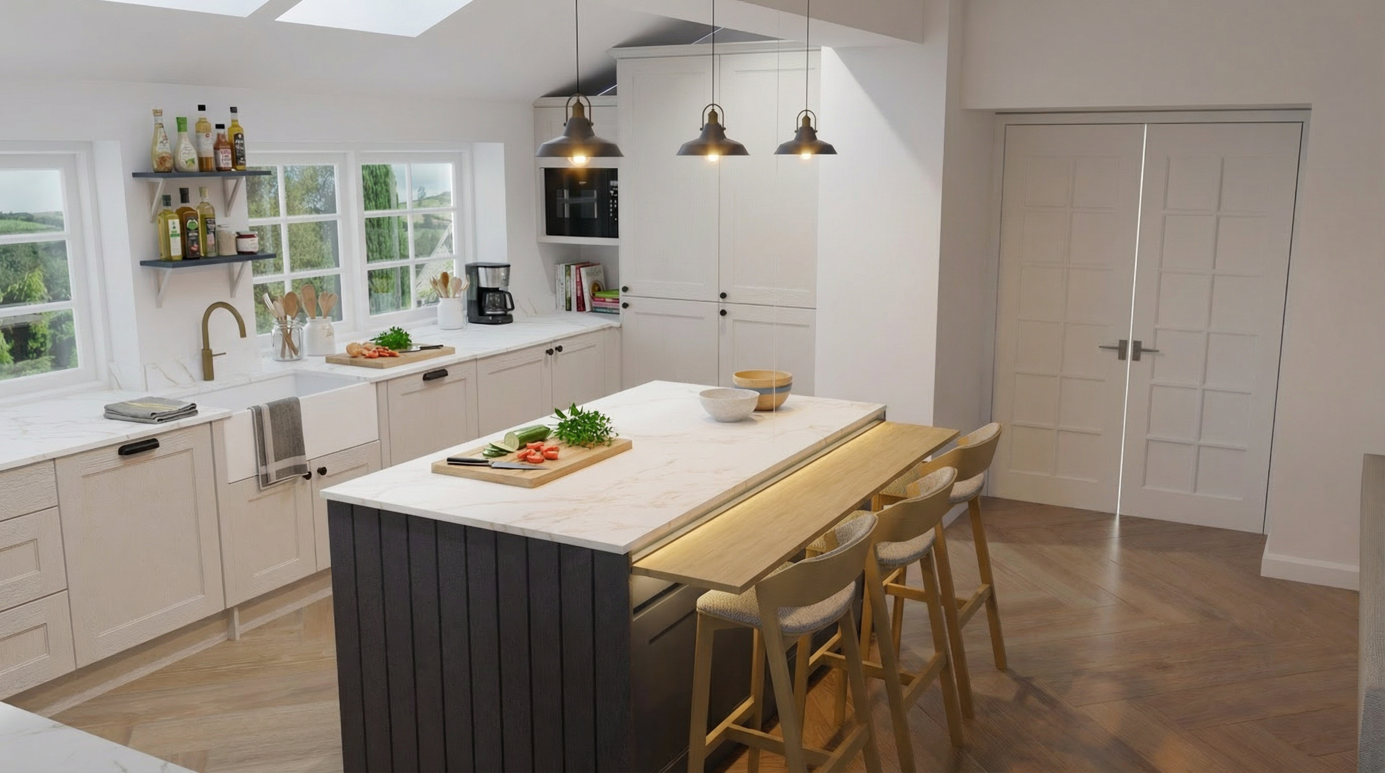 natural lighting recipe books under microwave dressing on shelf chopping board with vegetables on countertop in front of window dress the kitchen add downlighting under the countertop on the panelled end of the island