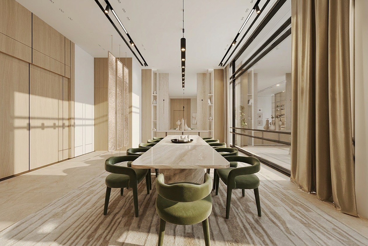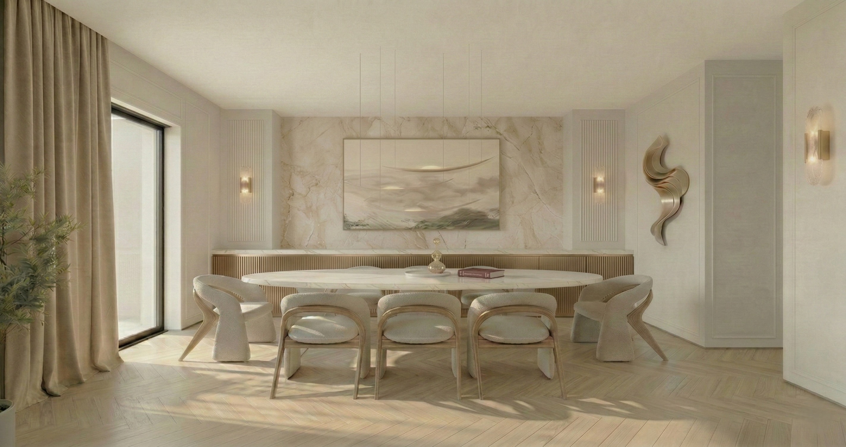 take this semi final render and enhance realism without altering any of the current image s geometry features or objects as well as image orientation no cropping zooming etc final result must be 4k do not add any new objects keep the herringbone pattern exactly as is but increase the tonal variation between individual planks each stave should have a distinct natural shade ranging from light sand to muted beige change the surface to an ultramatte raw timber texture with visible open grain removing all artificial sheen or plastic like smoothness the goal is to see a clear organic contrast in color from one tile to the next emphasizing its wooden nature yet making the effect visible yet delicate and so it doesnt stand out too much the goal is for the change from the original to be subtle as for the materials though its important to make them clear and visible we are aiming to respect the softness and elegance of the composition as a whole for that reason no exaggerated contrasts or saturations are welcomed here result must be elegant clear high res 4k for client viewing