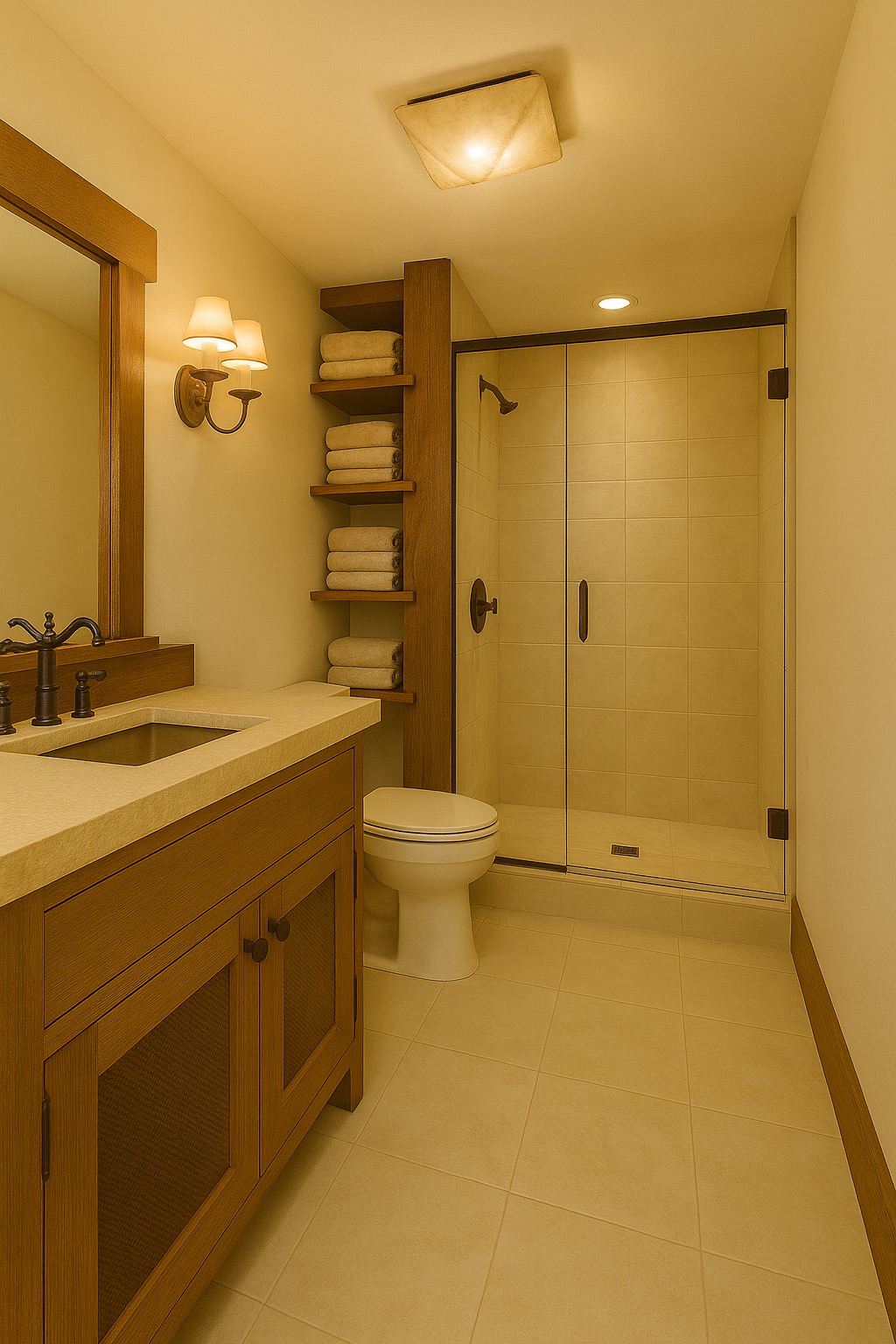 change the tile to stone change the lights to a rustic bronze sconce with single shade architecture