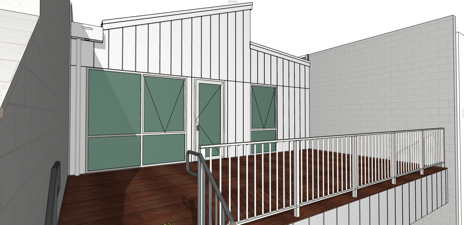 exterior shot render a modern architectural scene featuring a building facade with large teal glass doors and windows the structure has crisp white vertical paneling and a sleek design the atmosphere should feel contemporary and inviting include a wooden deck with rich dark brown tones complemented by a smooth silver handrail the surrounding walls should be a light soft gray adding a neutral contrast aim for a bright clear sky to create a clean and open ambiance