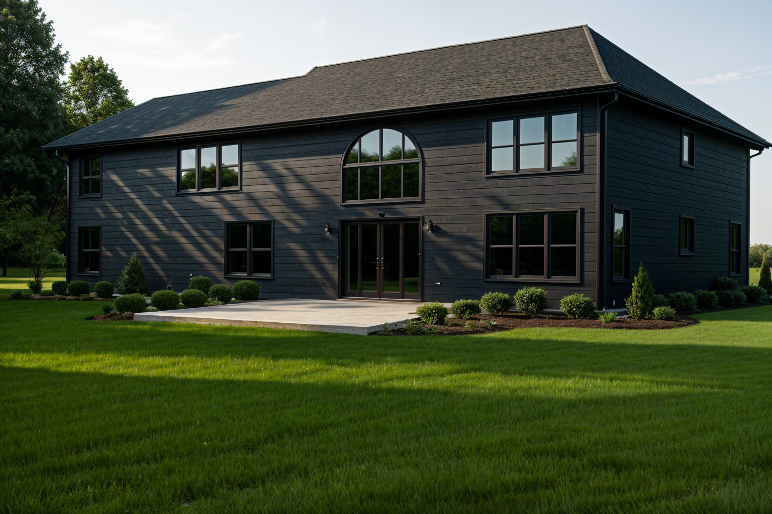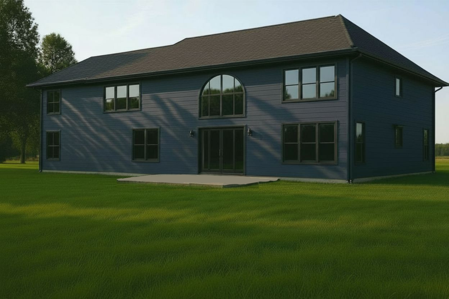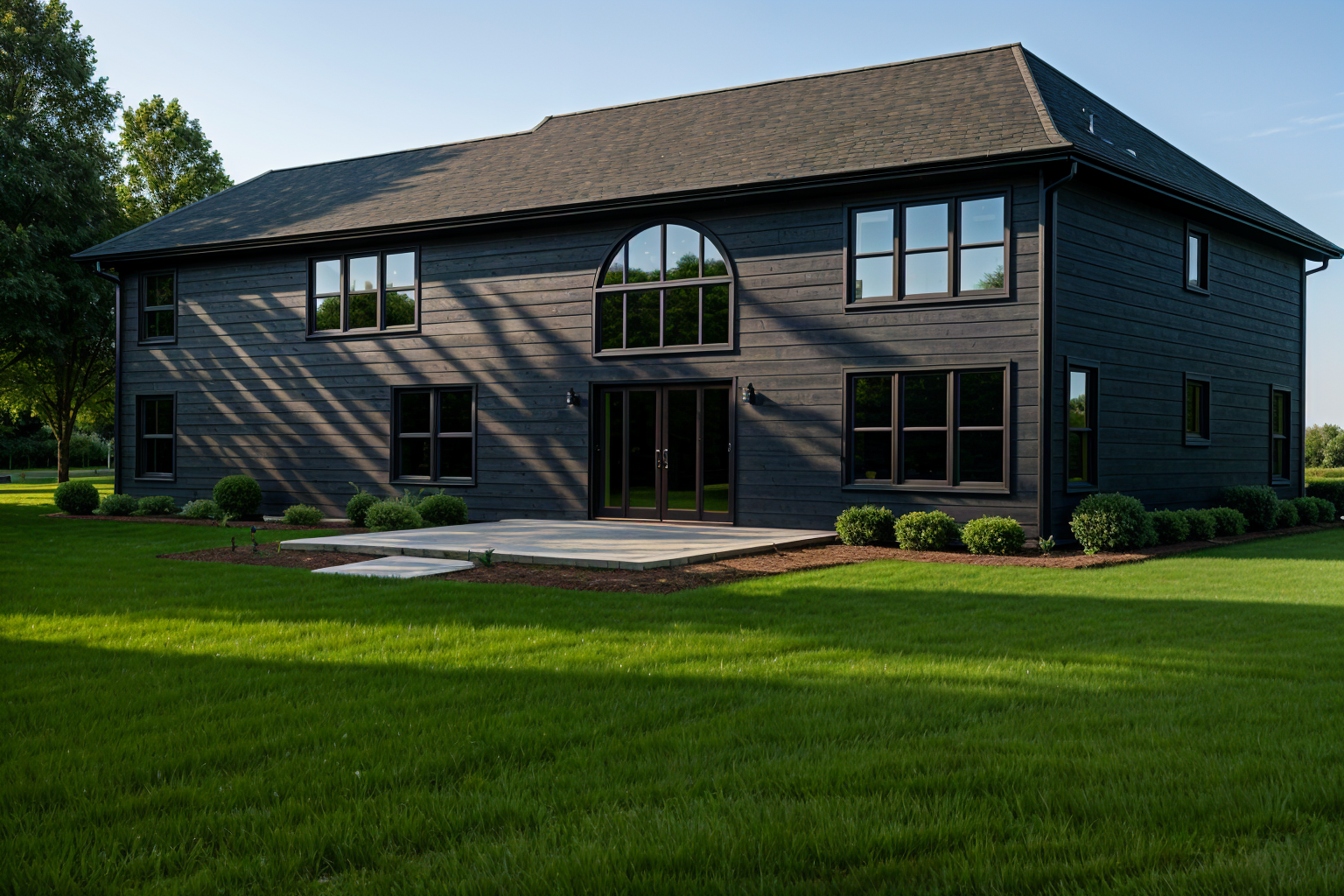 dark blue siding stamped concrete patio in current position black window trim black gutters