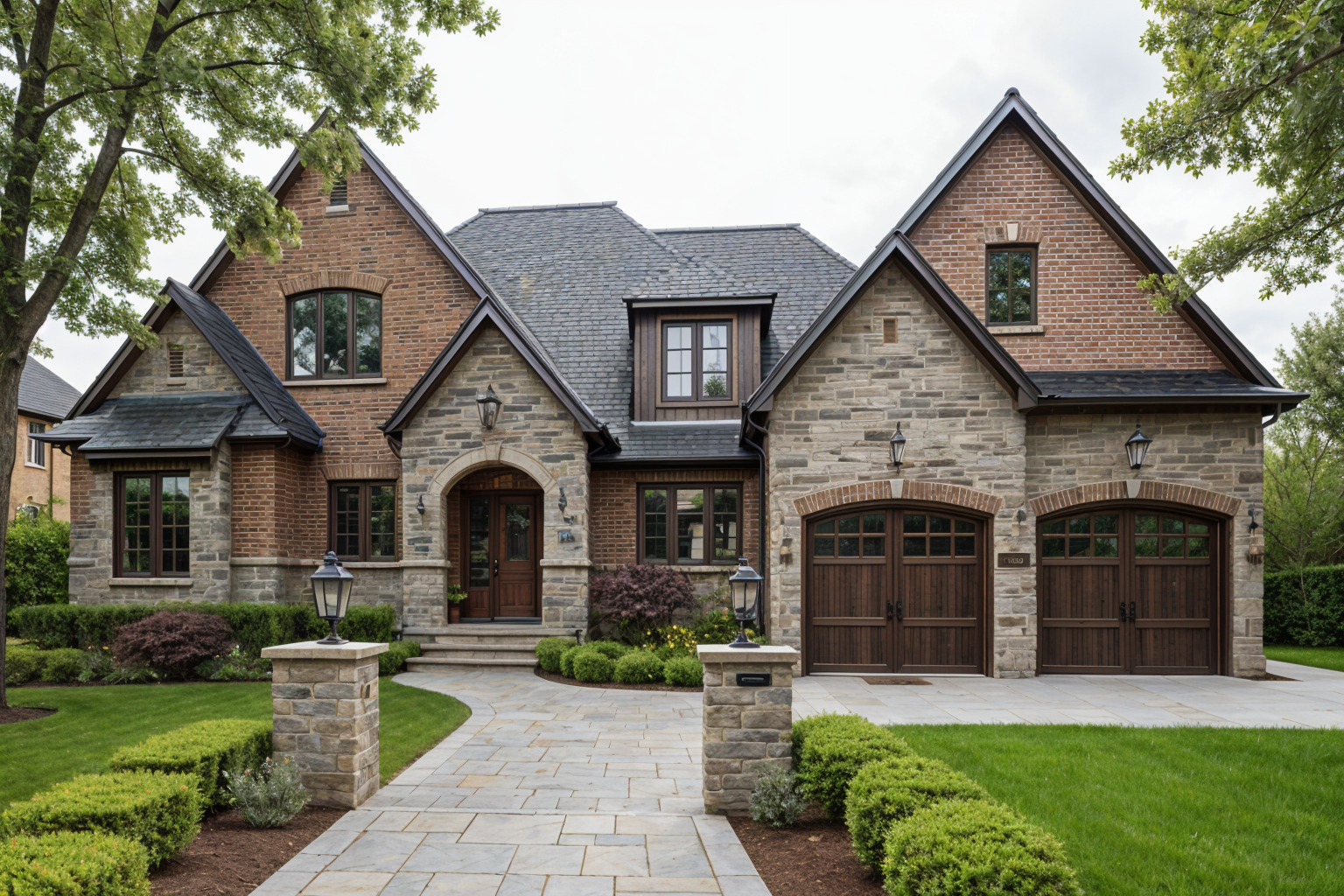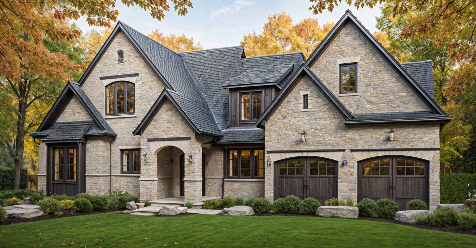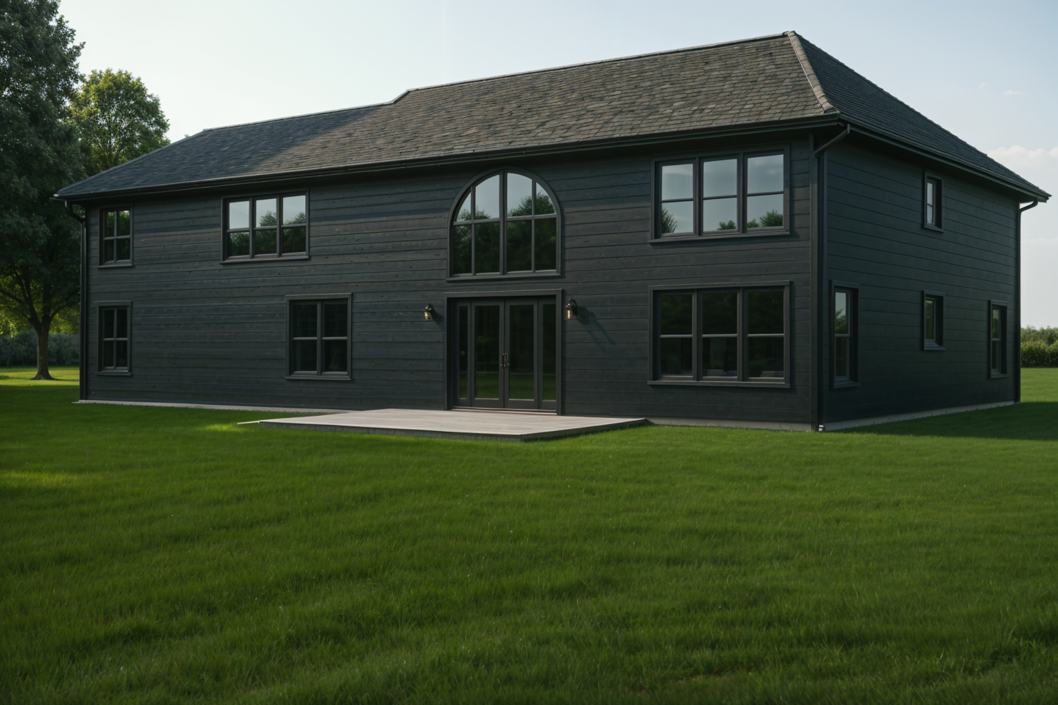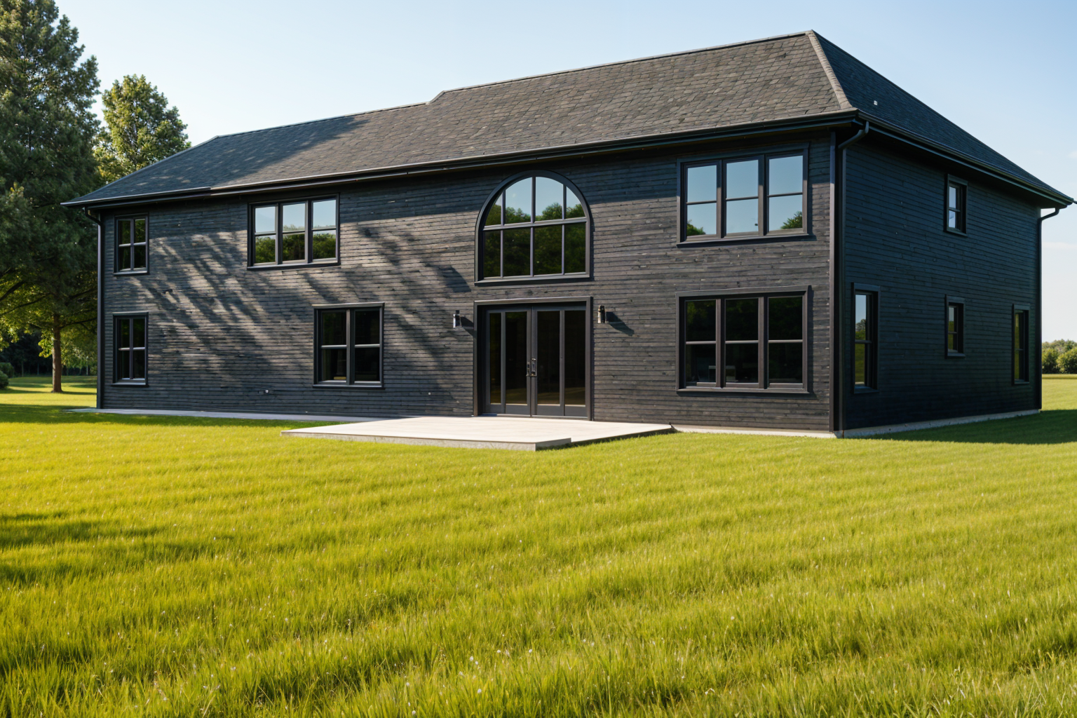 dark blue siding stamped concrete patio in current position black window trim black gutters