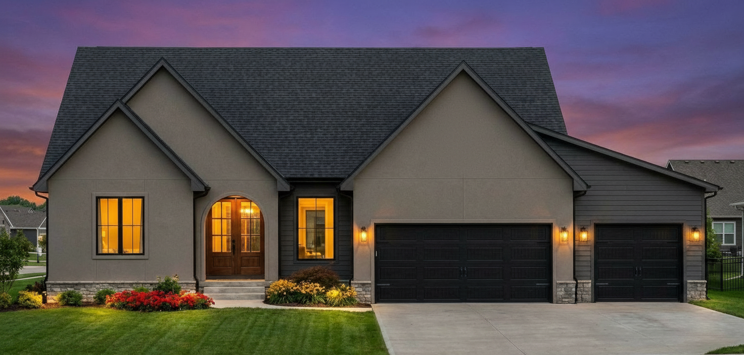 create a photorealistic rendering emphasizing the scale of the gables and beauty of the front porch