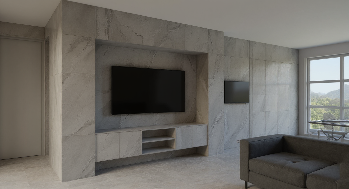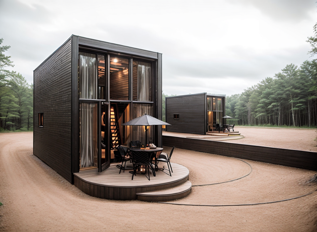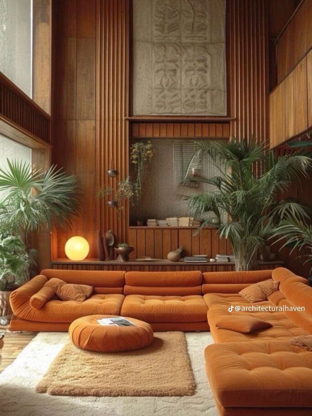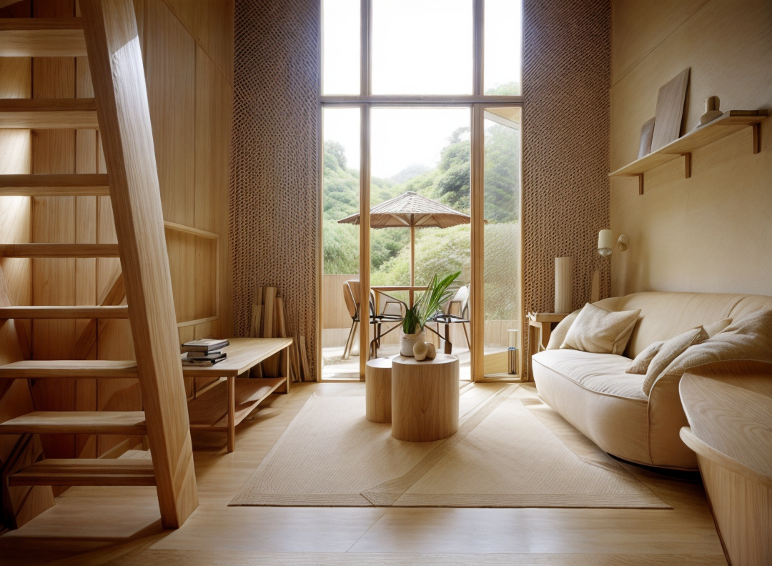 interior from the top enhance this interior rendering with better lighting and more realistic materials using the same colors and materials as the moodboard do not add any extra furniture or details make the floor concrete and the stair in a green color forest outside