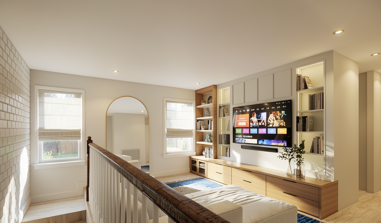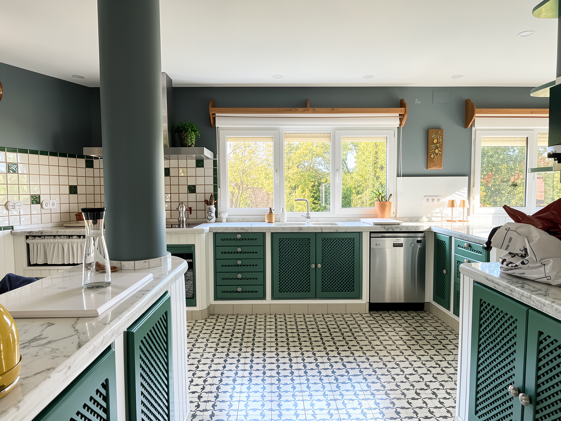 show the entry on full building length by showing two bays on both side of the entry keep the same scheme of colors make the tree on both side of the entry red instead of green