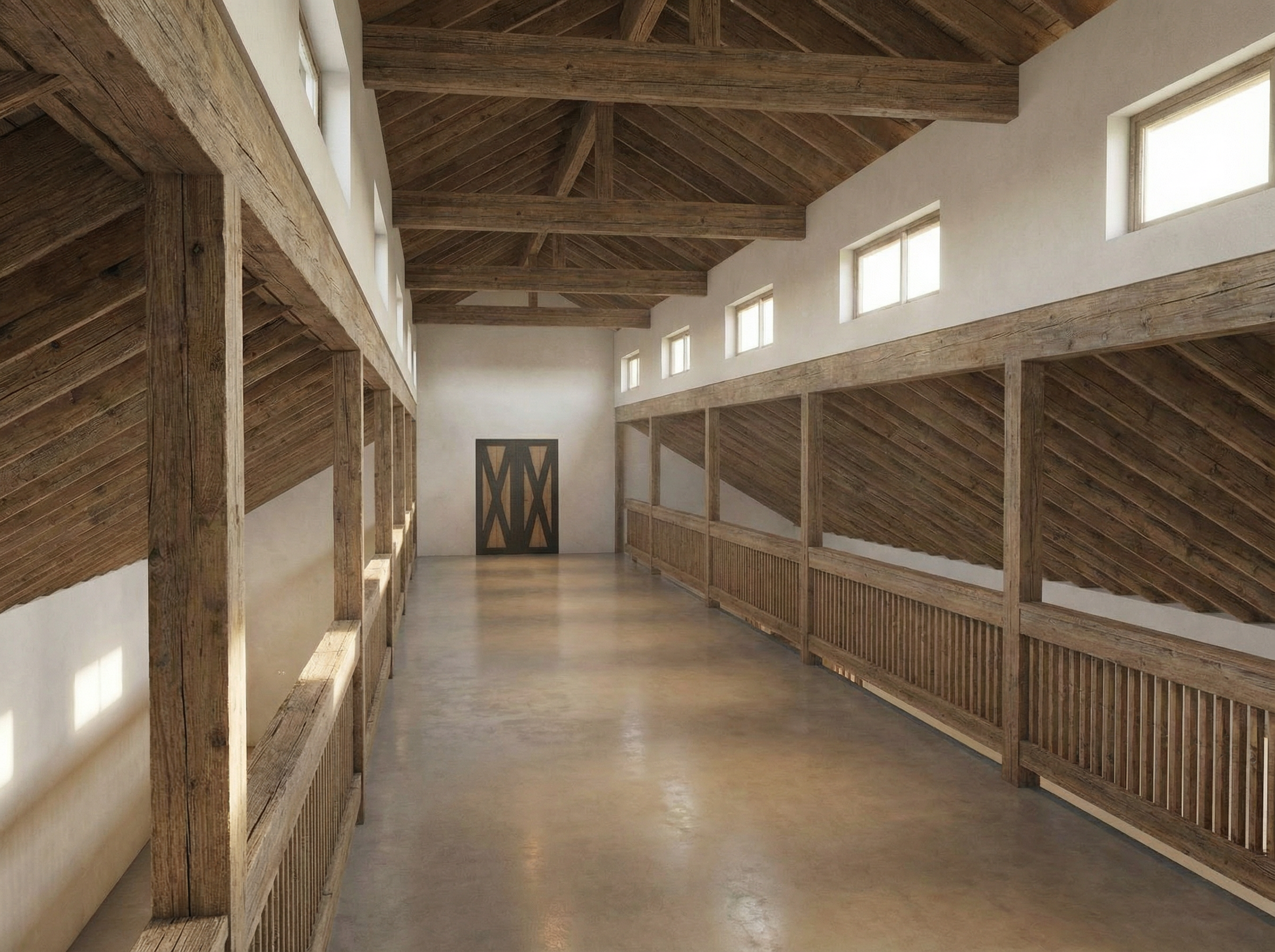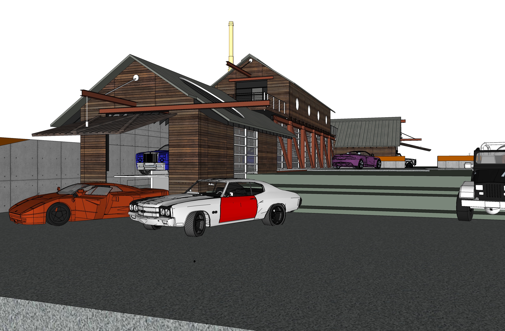 modern industrial design large grid windows red steel structure with wood building hyperrealistic with people