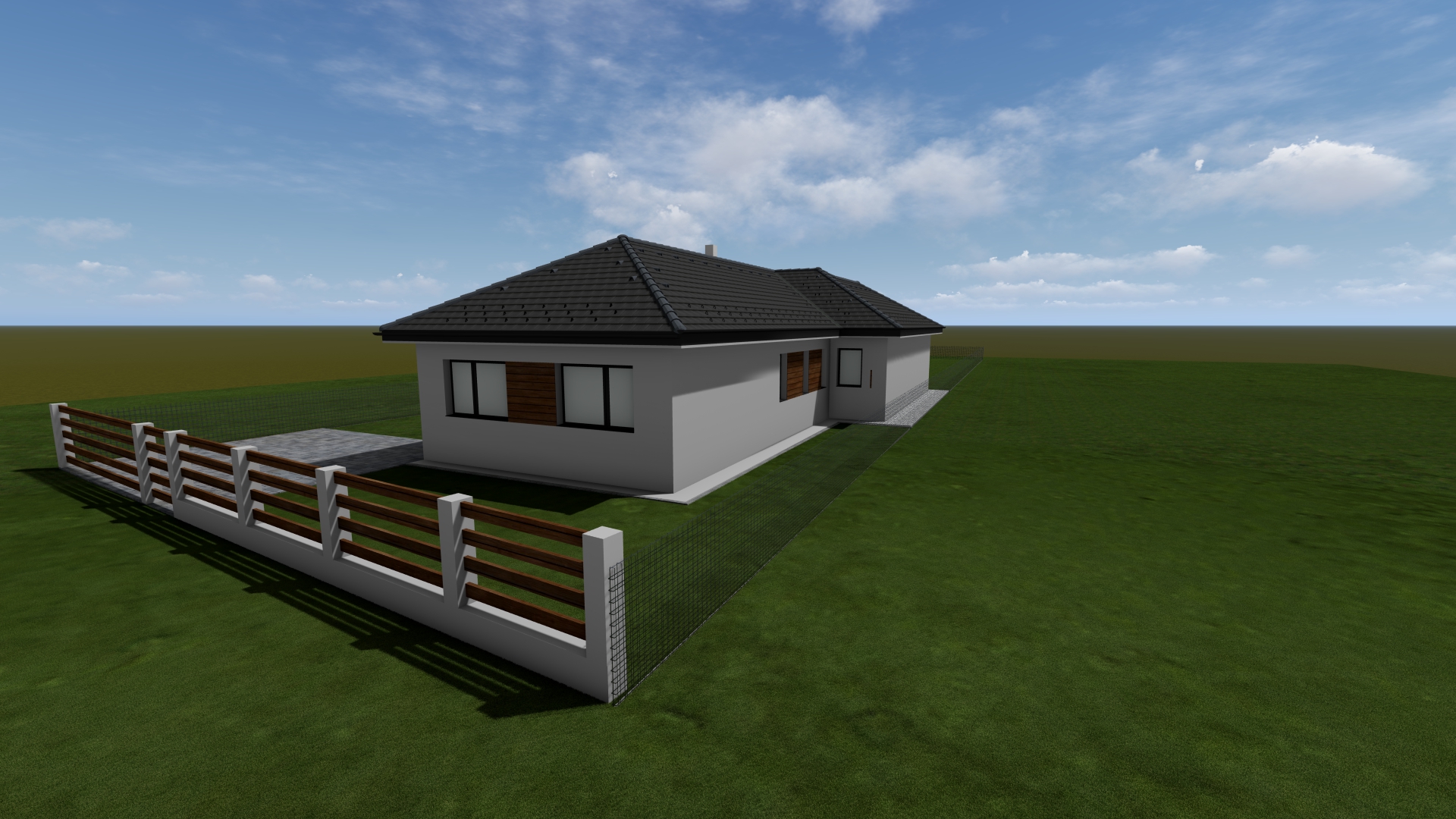 render a photorealistic 3d perspective of this house in a hungary hyper realistic 8k cinematic lighting serene atmosphere photorealistic textures keep model geometry the same windows doors roof walls pavement driveway fence facade decor reference the current material style just enhance them do not change the view only enhance the current materials and make the landscape nicer vegetation detailed textures in the wood siding and glass reflections and a vibrant clear sky with light atmospheric depth render in hyper realistic architectural visualization quality 8k resolution roof minimalist anthracite concrete tile facade a mix of smooth white mineral plaster horizontal walnut wood slats windows antracit aluminium minimal fence anthracite colored premium metal mesh landscape professional minimalist garden design green clean cut grass whether nice clear early summer in middle europe neighbour houses rural residential environment modern family houses trees and bushes next door fence anthracite colored premium metal mesh landscape professional minimalist garden design green clean cut grass whether nice clear early summer in middle europe rural residential environment modern family houses trees and bushes
