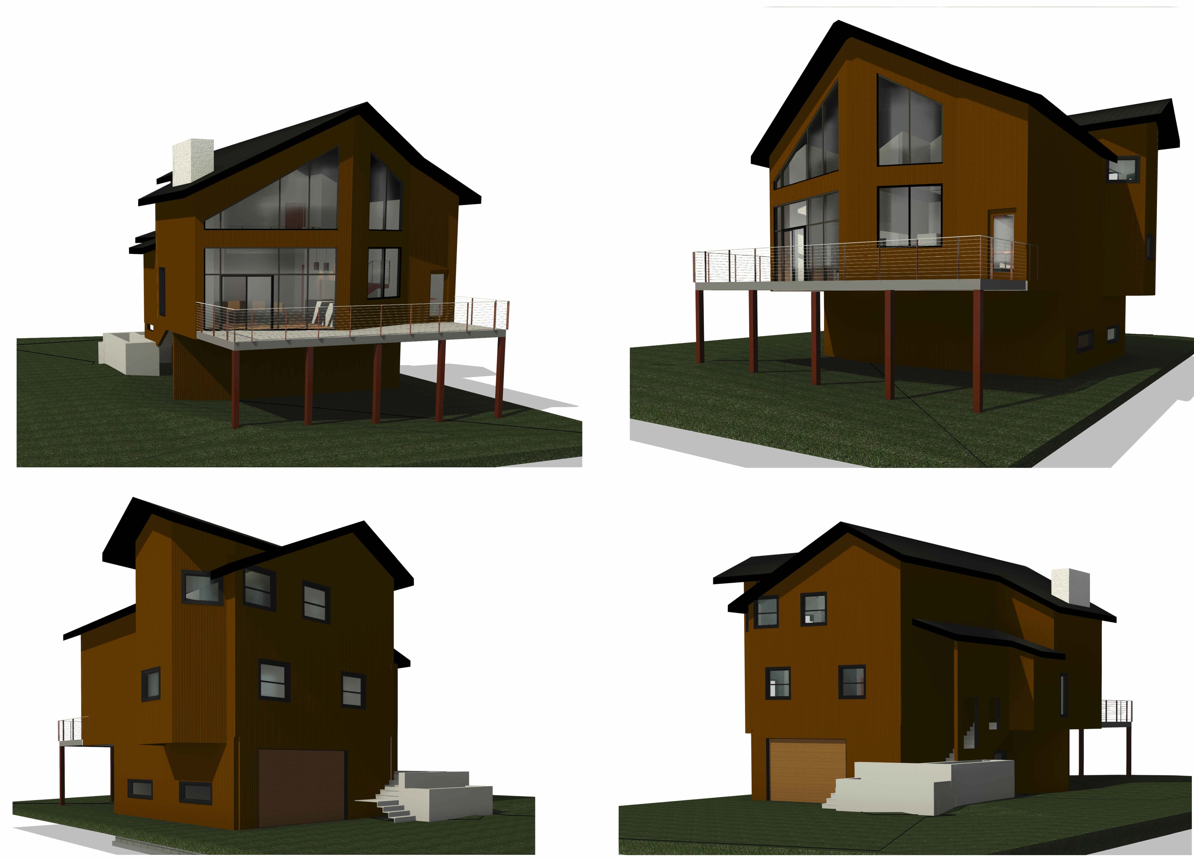add background tress and mountain lake and modernize the building a bit with the same dark metal exterior and materials each building is the same so they need the same material