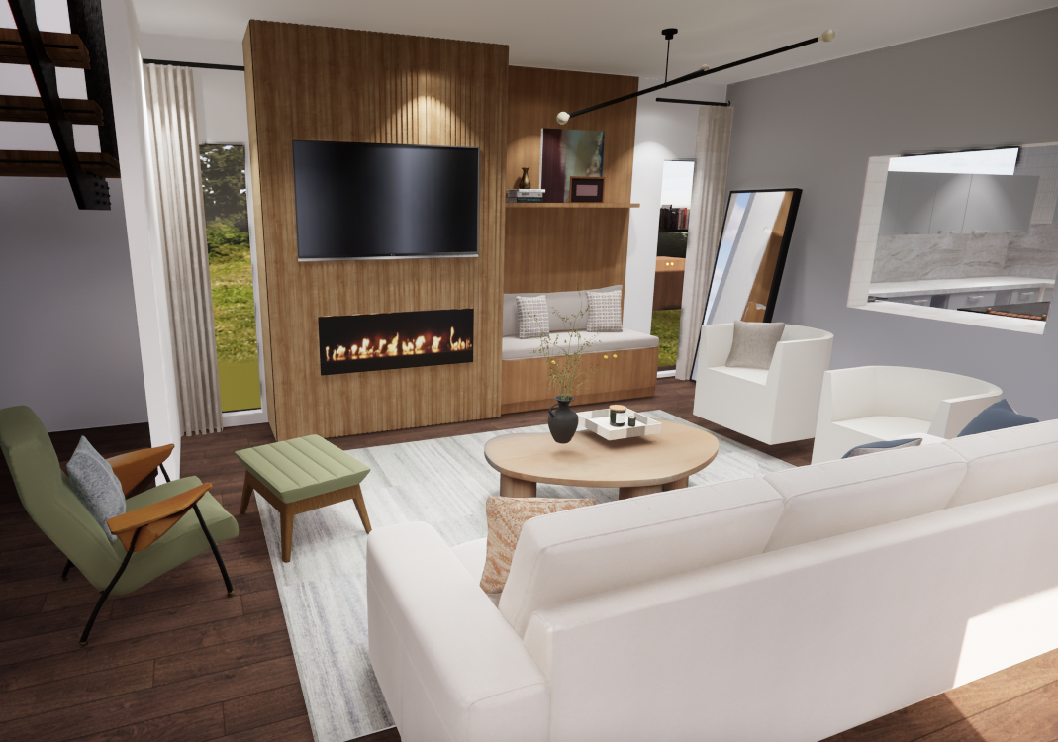 transform the provided living room interior image into a high end photorealistic render with warm bright and airy atmosphere soft glowing highlights and relaxed upscale energy while keeping everything exactly the same same proportions same color of wood same wall color same ceiling light fixture same wall finishes same beige pattern curtains same materials and same spatial configuration do not move or alter any objects geometry textures colors or furniture positions the chairs throughout the living room must remain exactly in the same locations and proportions but their materials should read realistically the chairs should appear upholstered in soft chenille beige fabric with subtle natural sheen and cushioned tactile texture lighting should emphasize bright and airy warmth gentle reflections soft shadows enhanced color richness and luxurious catalog level realism improve depth and realism through soft white oak wood grain richness shine brass highlights fabric texture and polished clarity while keeping the entire scene exactly as originally designed