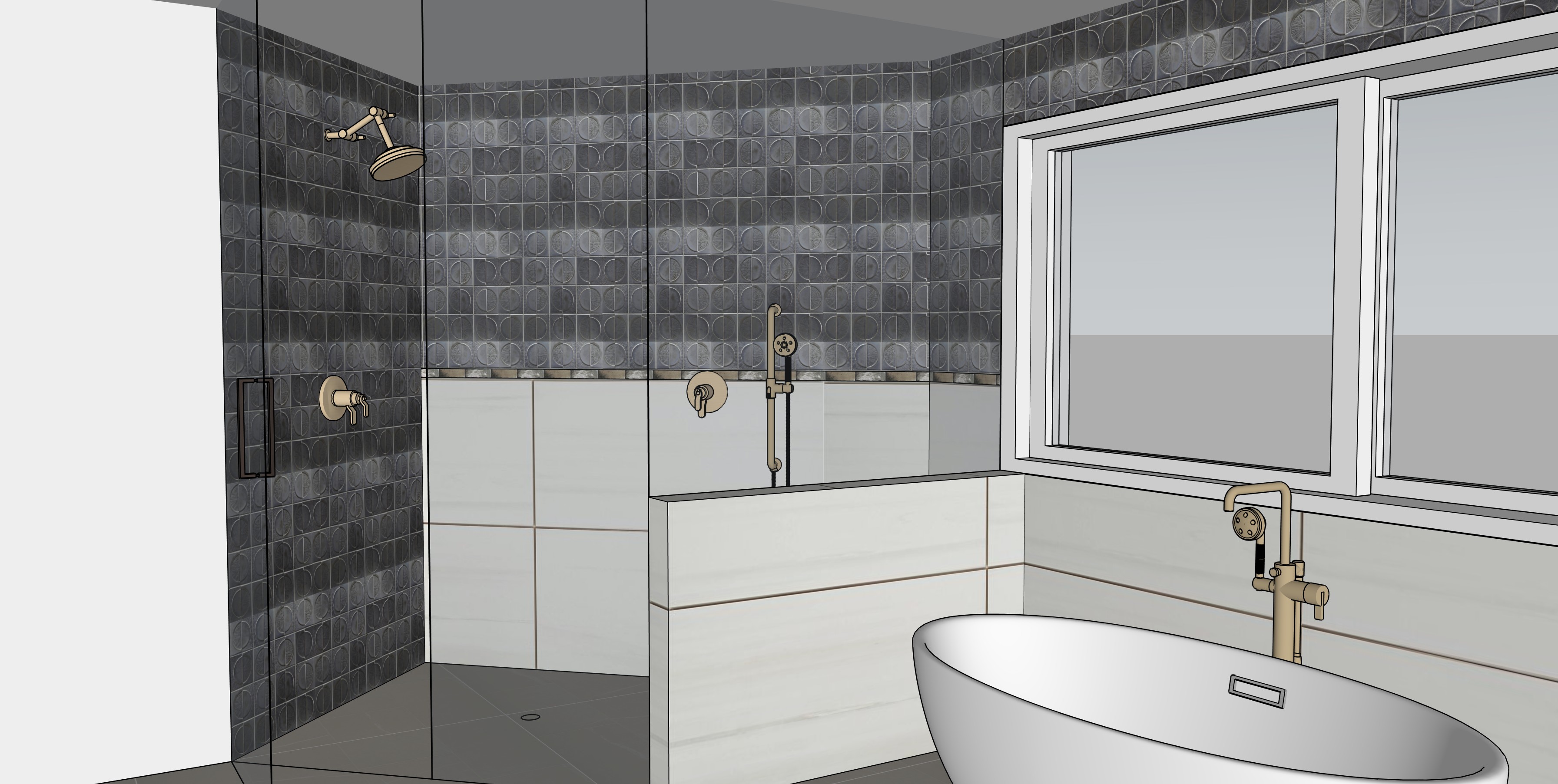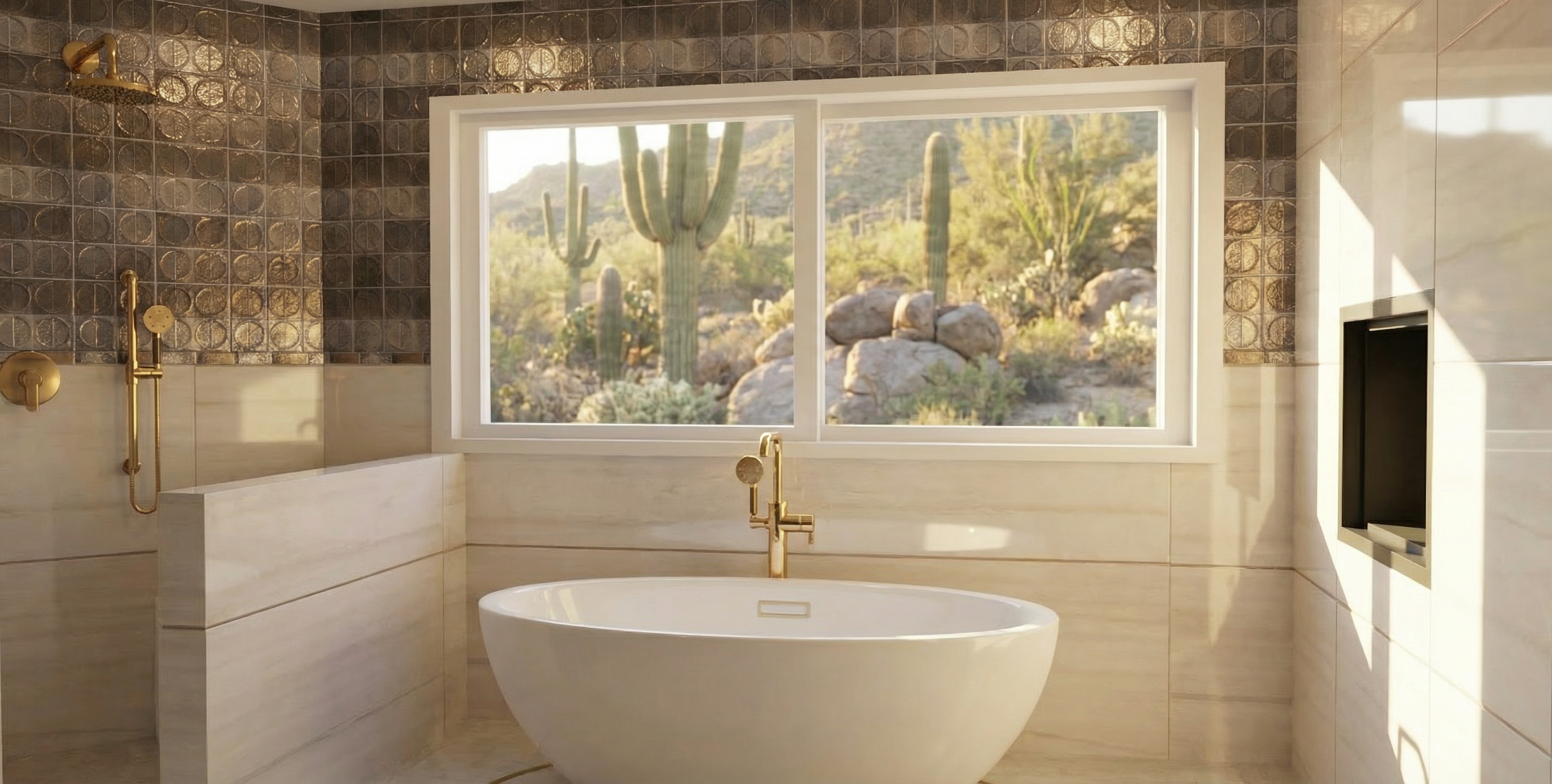 bronze tiles on walls shimmers marble tiles on lower half of walls with soft subtle warm veining polished brass plumbing fixtures which includes shower handles and tub filler window with view of arizona desert