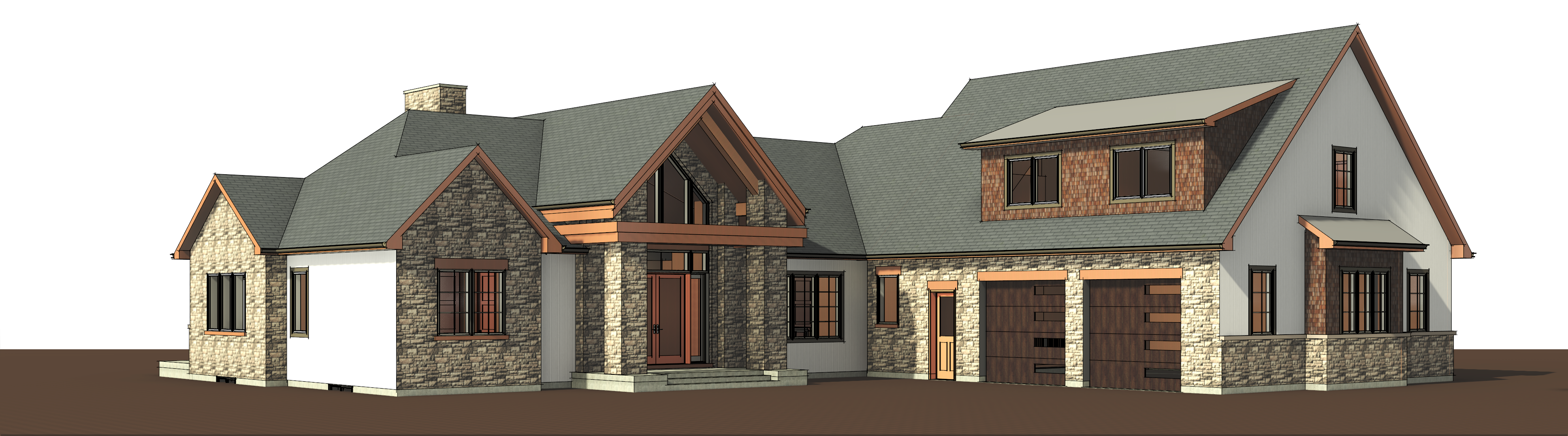 moss green vertical board and batten siding grey stone wood shakes to be same colour as board and batten siding black windows walnut wood grain garage doors make rendering realistic with grass driveway to garage doors walkway from driveway to porch and sky with clouds