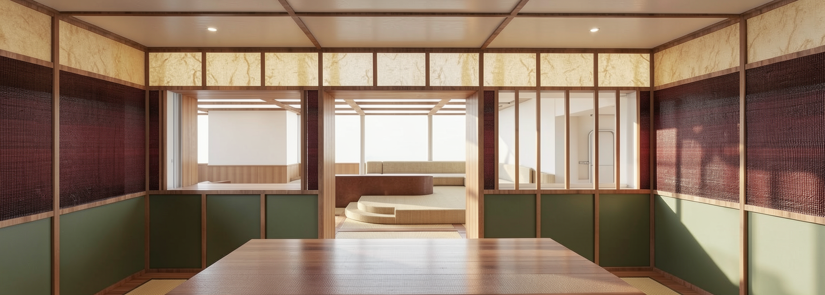 this is the dining area of a luxury yacht the floor is tatami and wood the dado is painted the middle is horsehair fabric the top is parchment keep the proportions the same but make the render nicer
