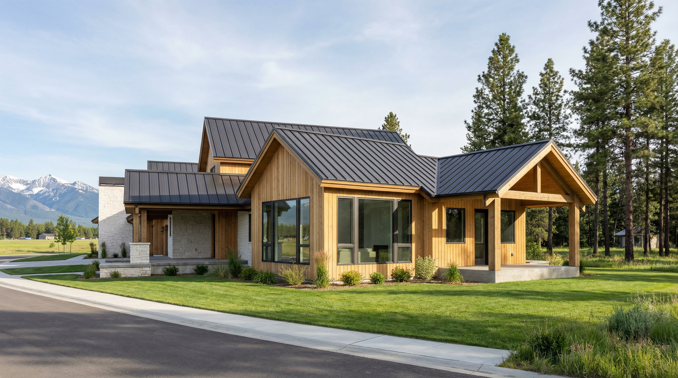 create a photorealistic rendering park city style landscape soft shadows golden hour sky dramatic clouds realistic rocks no grass add mountain landscaping around the rocks with some plants realistic water for in ground hot tub scandinavian style house