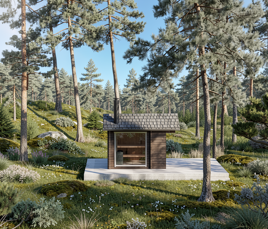render a photorealistic 3d perspective of this sauna the current material style current material colour keep model geometry the same windows doors roof walls make a green meadow with moss gray several pine trees around looks native to swedsih forest do not change relief do not change the view only enhance the current materials and make the landscape nicer vegetation detailed textures in the wood siding and a vibrant clear sky with light atmospheric depth render in hyper realistic architectural visualization quality 8k resolution