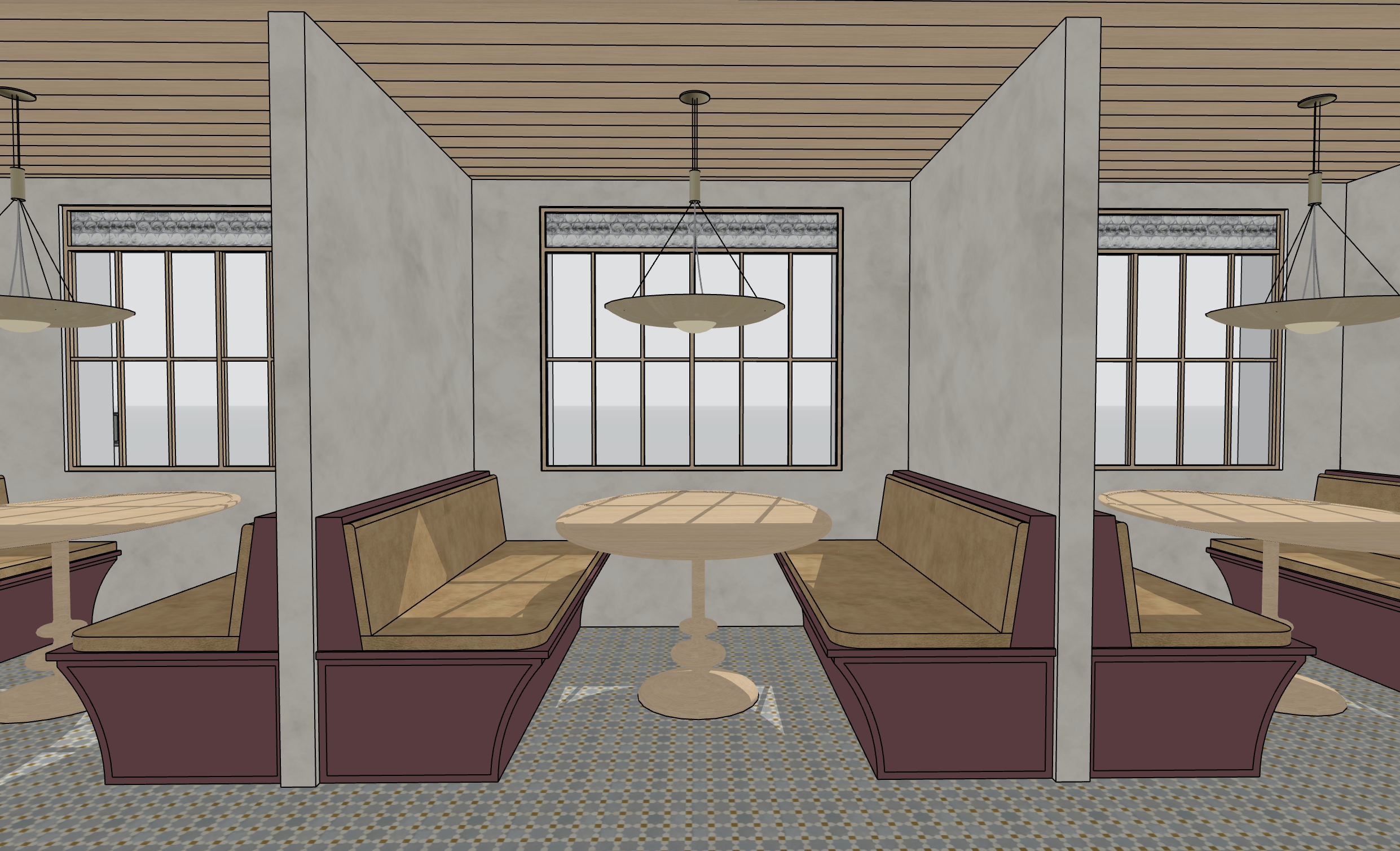 keep colors and materials as is shown an outdoor street view through the windows and just enhance the lighting and realism