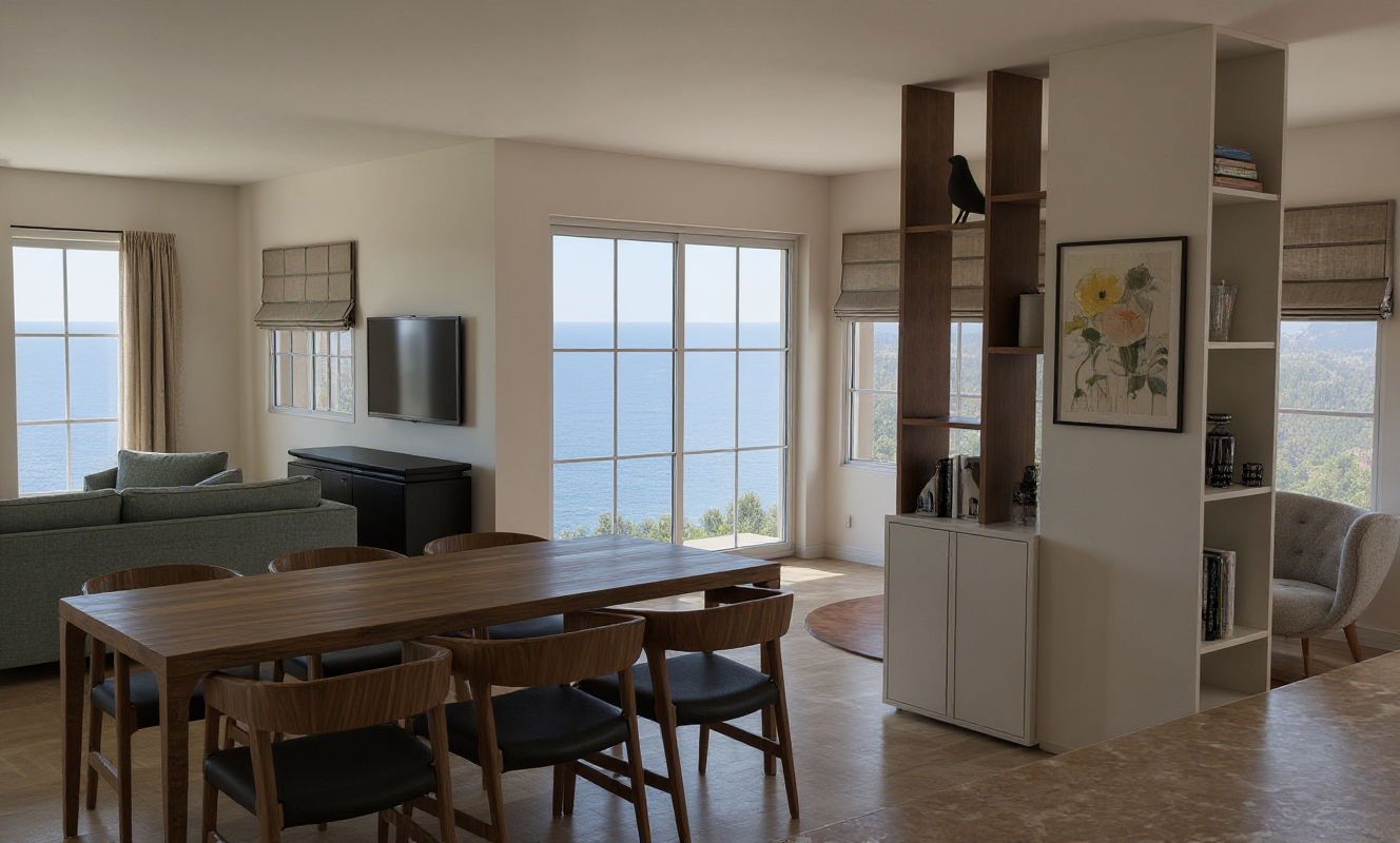 create a beautiful architecture magazine worthy image of this building keep colors textures and existing elements show cars people eating outside and a lively ambiance dramatic vibe
