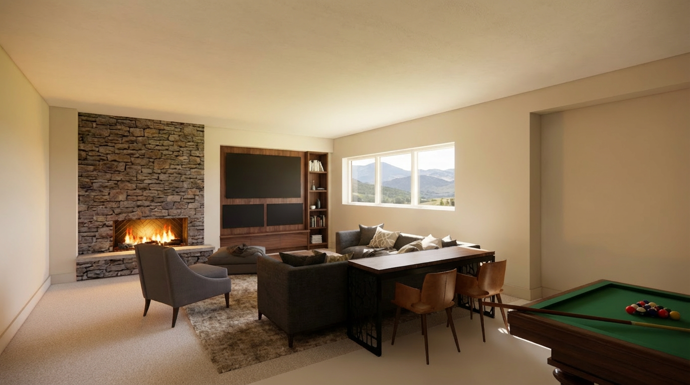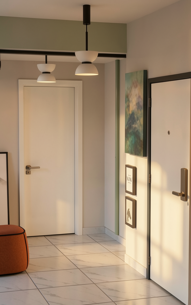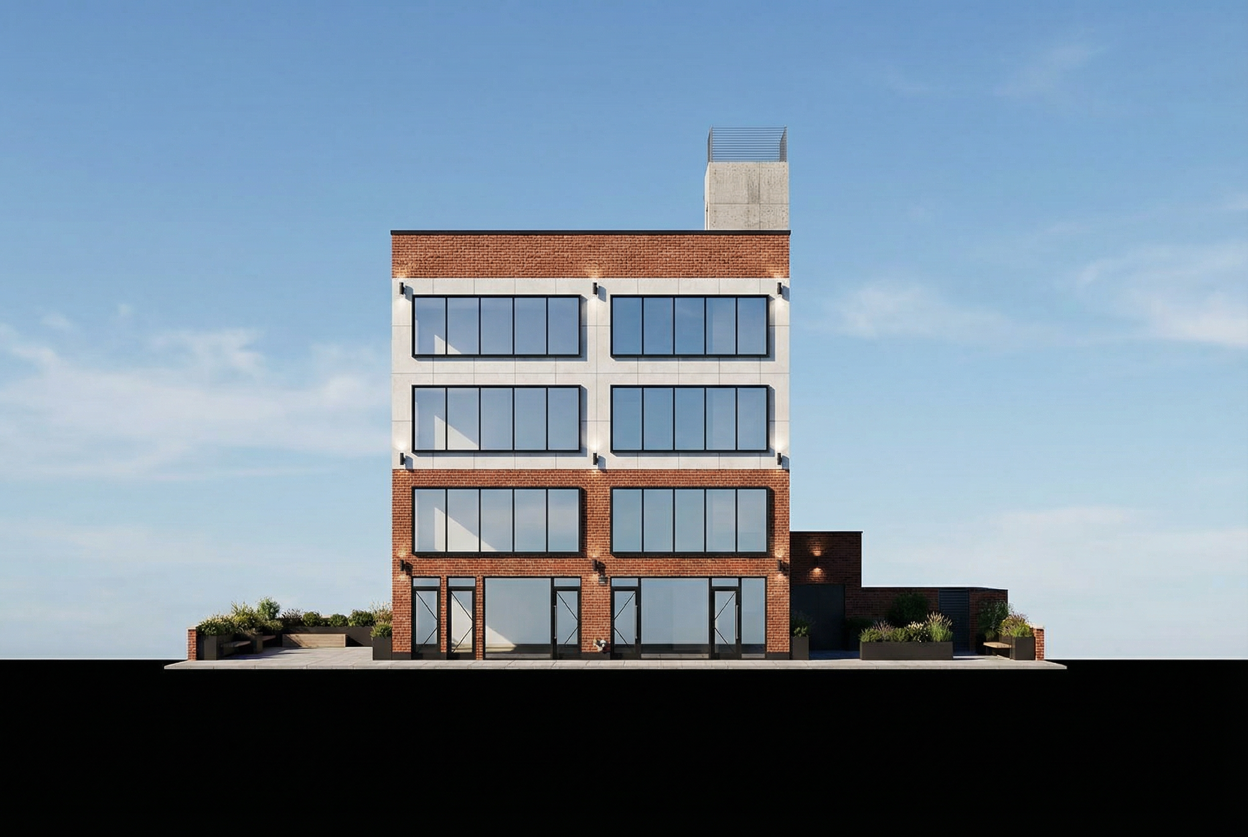 transform this architectural elevation line drawing into a photorealistic street level render maintain exact proportions window layout and facade composition from the drawing style contemporary urban mixed use building in new york city minimalist but warm modern design materials light smooth stucco or painted concrete facade off white warm red brick side volumes dark metal window frames black or charcoal clear large glass storefront at ground level lighting dusk early evening blue hour warm interior lighting glowing from inside 3000k soft facade uplighting at ground level environment nyc street corner context wet asphalt with subtle reflections crosswalk markings curb street lamps surrounding mid rise buildings brick glass mix details realistic glass reflections and interior depth subtle greenery planters or rooftop edge clean signage area no text or minimal placeholder camera eye level perspective from across intersection centered composition 35mm architectural lens mood calm refined slightly cinematic high end architectural visualization enscape v ray quality output ultra realistic high detail sharp 4k global illumination physically accurate materials