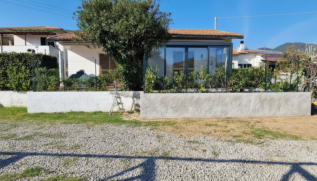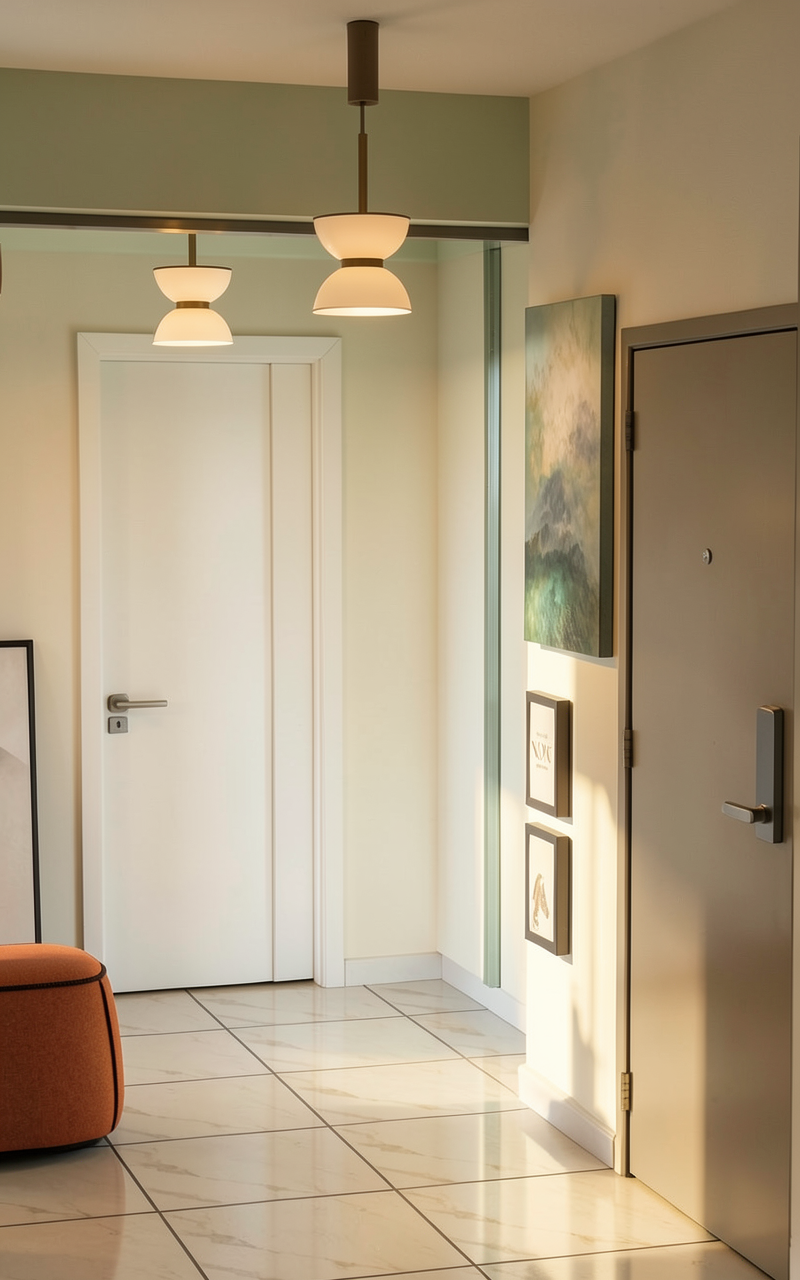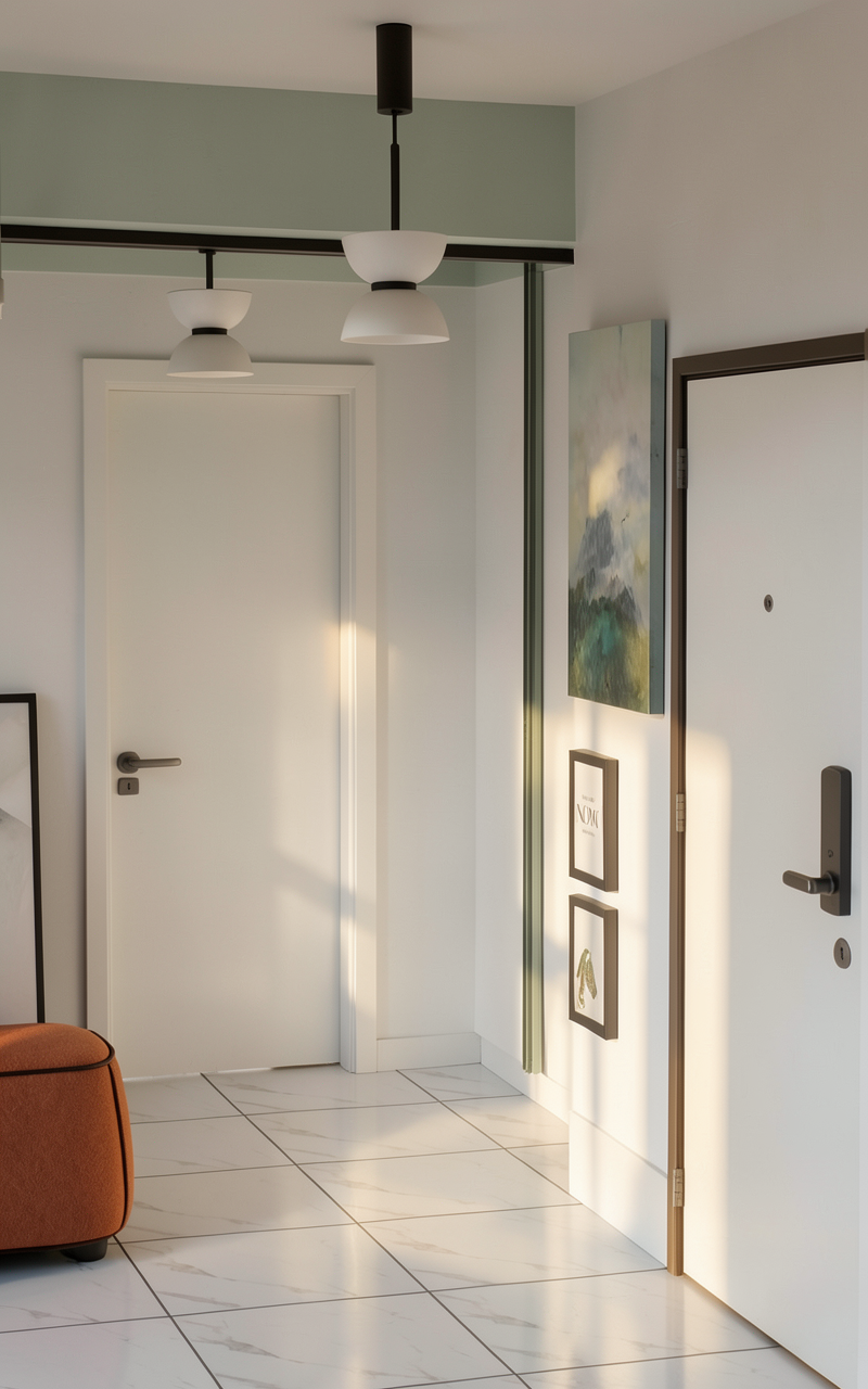 transform this architectural elevation line drawing into a photorealistic street level render maintain exact proportions window layout and facade composition from the drawing style contemporary urban mixed use building in new york city minimalist but warm modern design materials light smooth stucco or painted concrete facade off white warm red brick side volumes dark metal window frames black or charcoal clear large glass storefront at ground level lighting dusk early evening blue hour warm interior lighting glowing from inside 3000k soft facade uplighting at ground level environment nyc street corner context wet asphalt with subtle reflections crosswalk markings curb street lamps surrounding mid rise buildings brick glass mix details realistic glass reflections and interior depth subtle greenery planters or rooftop edge clean signage area no text or minimal placeholder camera eye level perspective from across intersection centered composition 35mm architectural lens mood calm refined slightly cinematic high end architectural visualization enscape v ray quality output ultra realistic high detail sharp 4k global illumination physically accurate materials