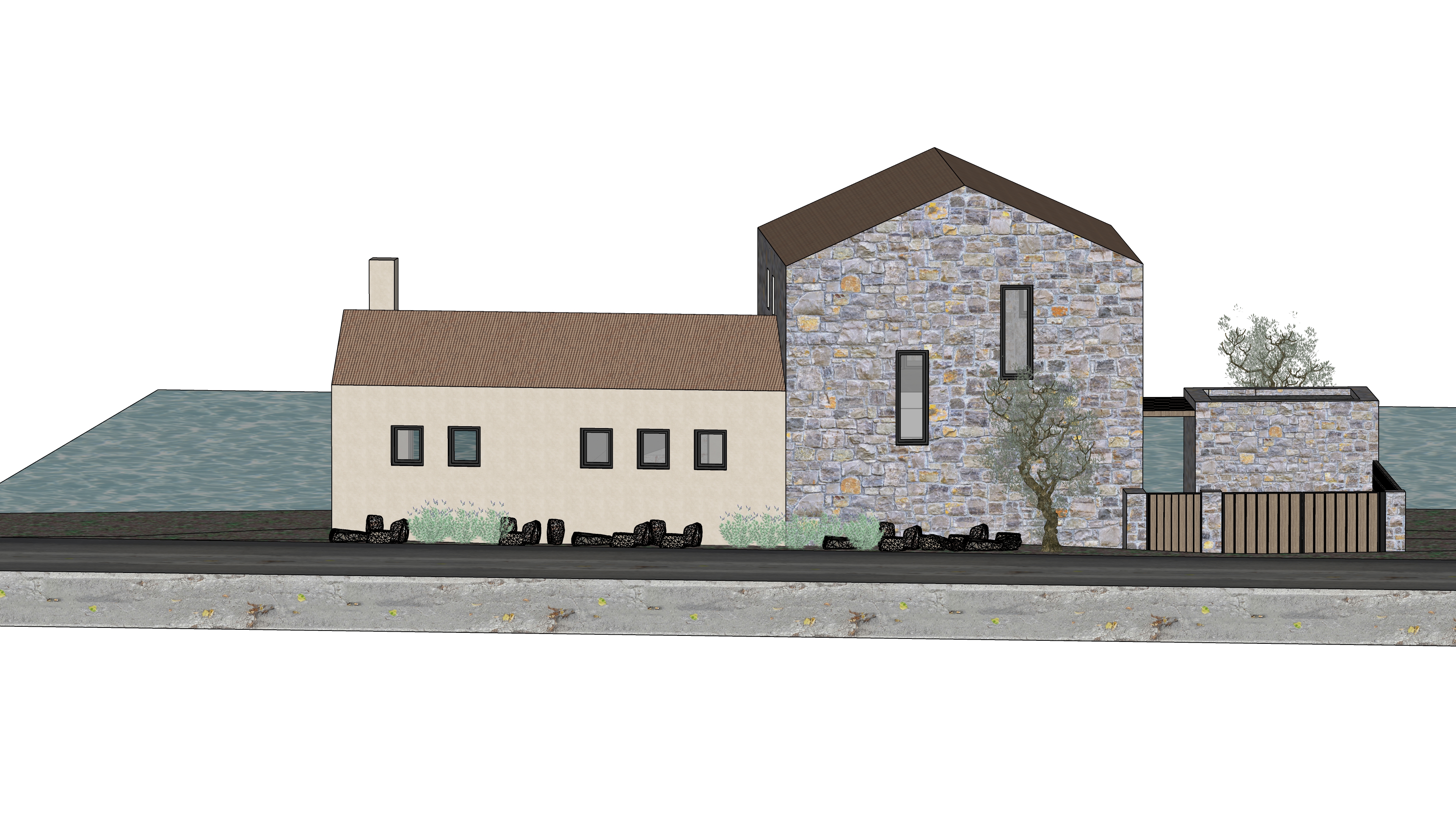 main prompt this is a house in thassos island by the sea the 2 storey volume is made of grey stone and the ground volume is plaster in cream tone the window frames are dark grey the entrance gate on the right side of the plot is medium oak wood in front of the house is a main road both volumes have a clay tile roof negative prompt do not change materials do not change geometry