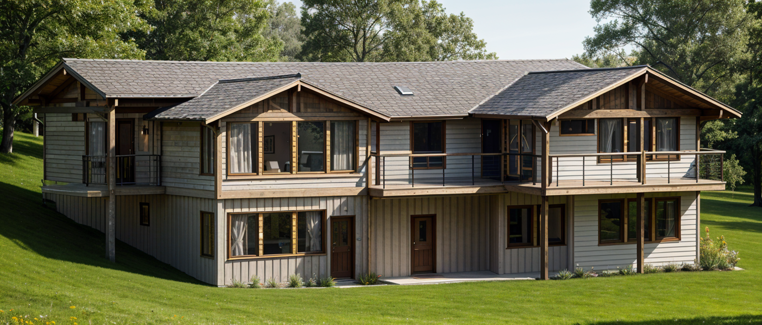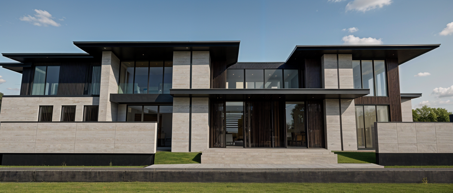 exterior walls uses a combination of off white limestone and dark gray planks dark gray aluminum cladding for ceiling main door in kamagong solid wood