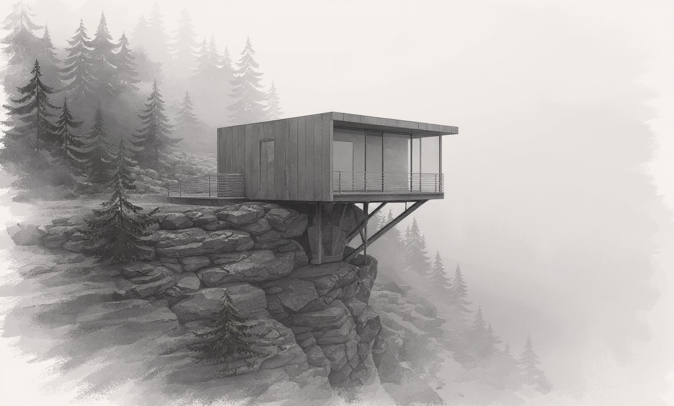 architectural realistic grayscale rendering of a small contemporary research station perched on a rocky cliff structure made of titanium panels black steel and glass precise and realistic architectural detailing cantilevered over stone terrain supported by steel beams surrounded by mountain pines and mist below rendered with crisp building geometry and realistic materials background and edges dissolve into the mist edges not full bleed with soft unfinished fade around the image soft ambient lighting overcast sky moody grayscale rendering high detail model aesthetic conceptual design architecture studio presentation style