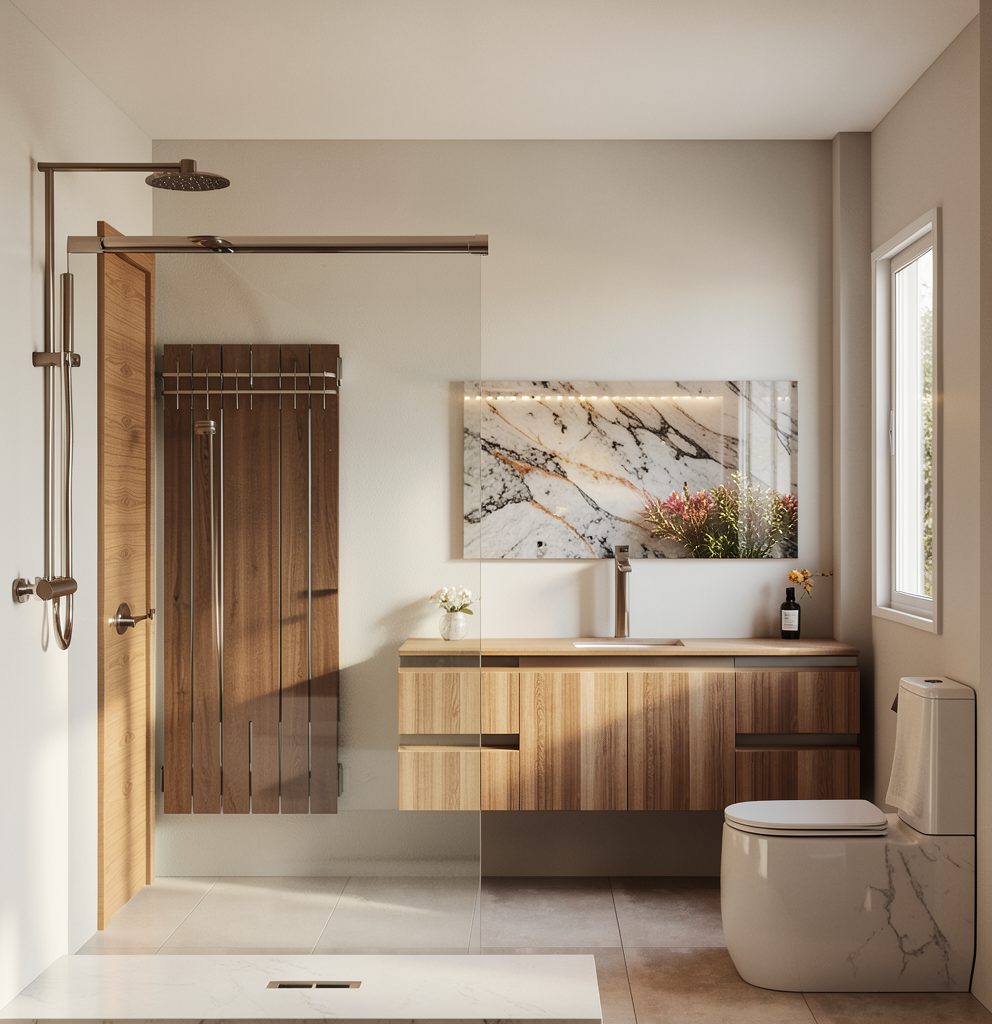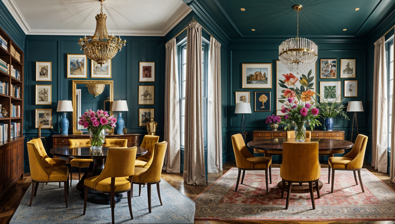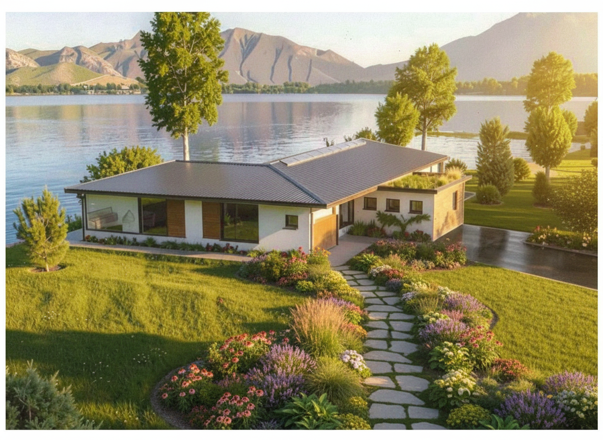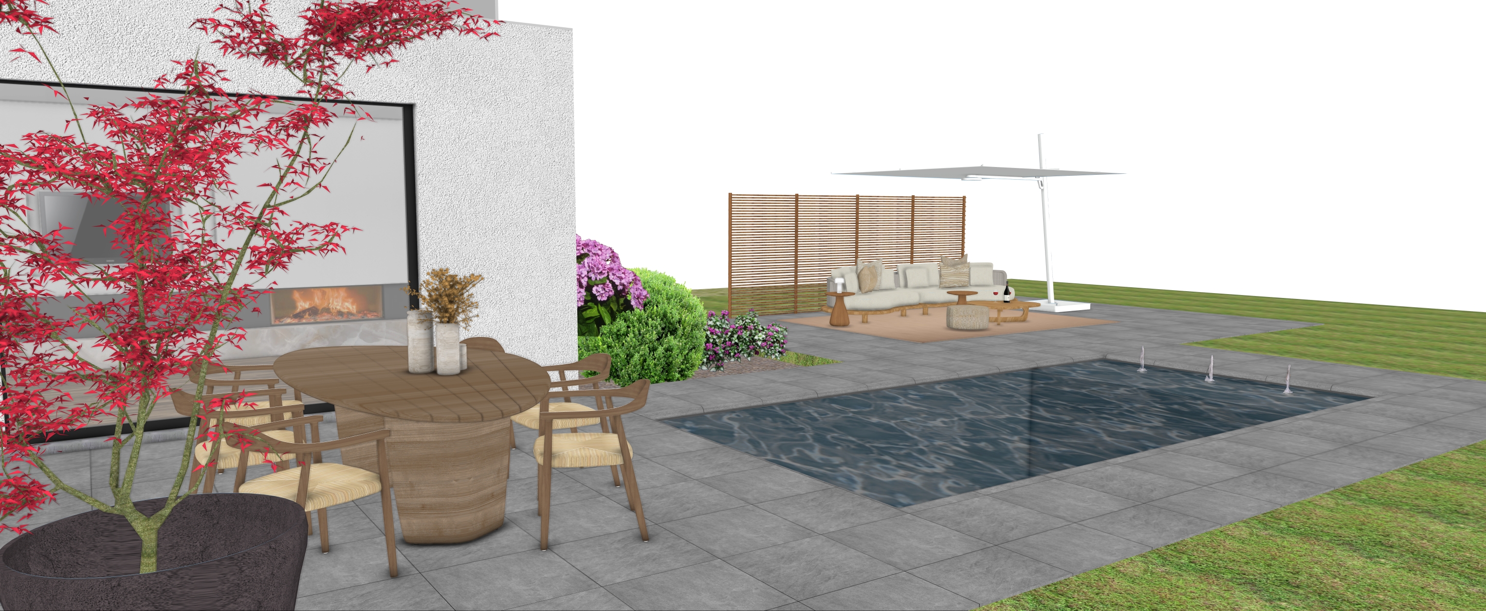 realistic garden with warm natural daylight keep colors textures and proportions sun at terrace middle grey tiles curtains in house no fireplace deep garden as background right hedge behind wooden wall no cushions on dining chairs