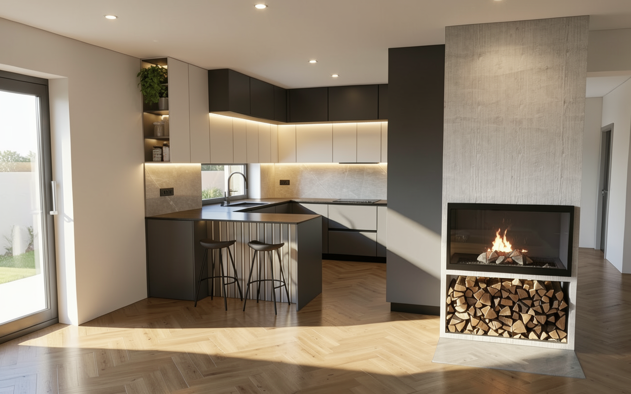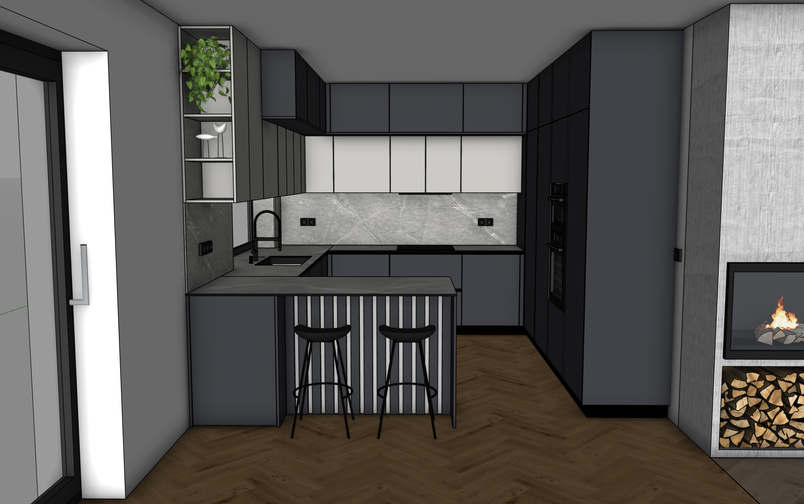 photorealistic render of the uploaded sketchup kitchen image preserve exact camera angle and all original textures materials no redesign add realistic warm led under cabinet lighting ceiling lights and sunny daylight from outside with global illumination and natural shadows ultra realistic architectural photo ray traced 8k