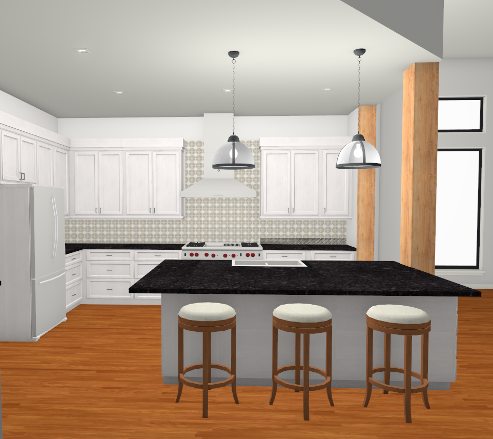 kitchen space white backsplash make sure to keep black leathered countertop with 0 veining white painted cabinets stainless steel vent hood vertical aged beams none on the ceiling keep cabinet design