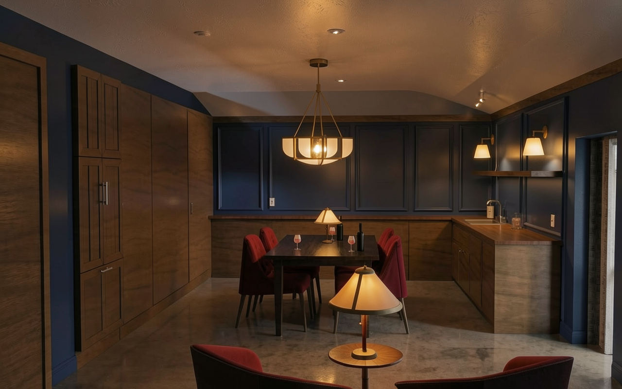 add navy blue panelling to walls warm lighting and moody navy blue vault ceiling change handle on left to brass