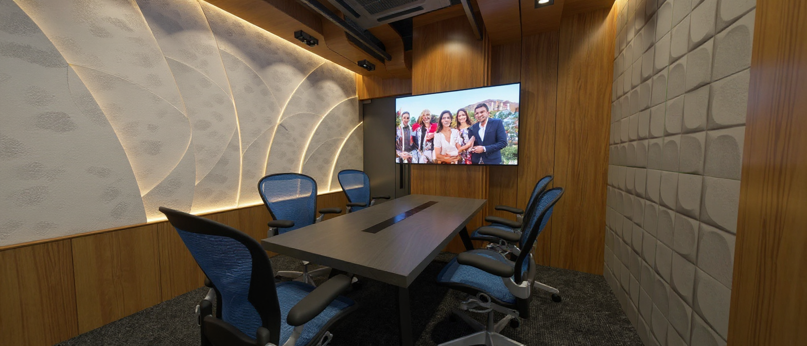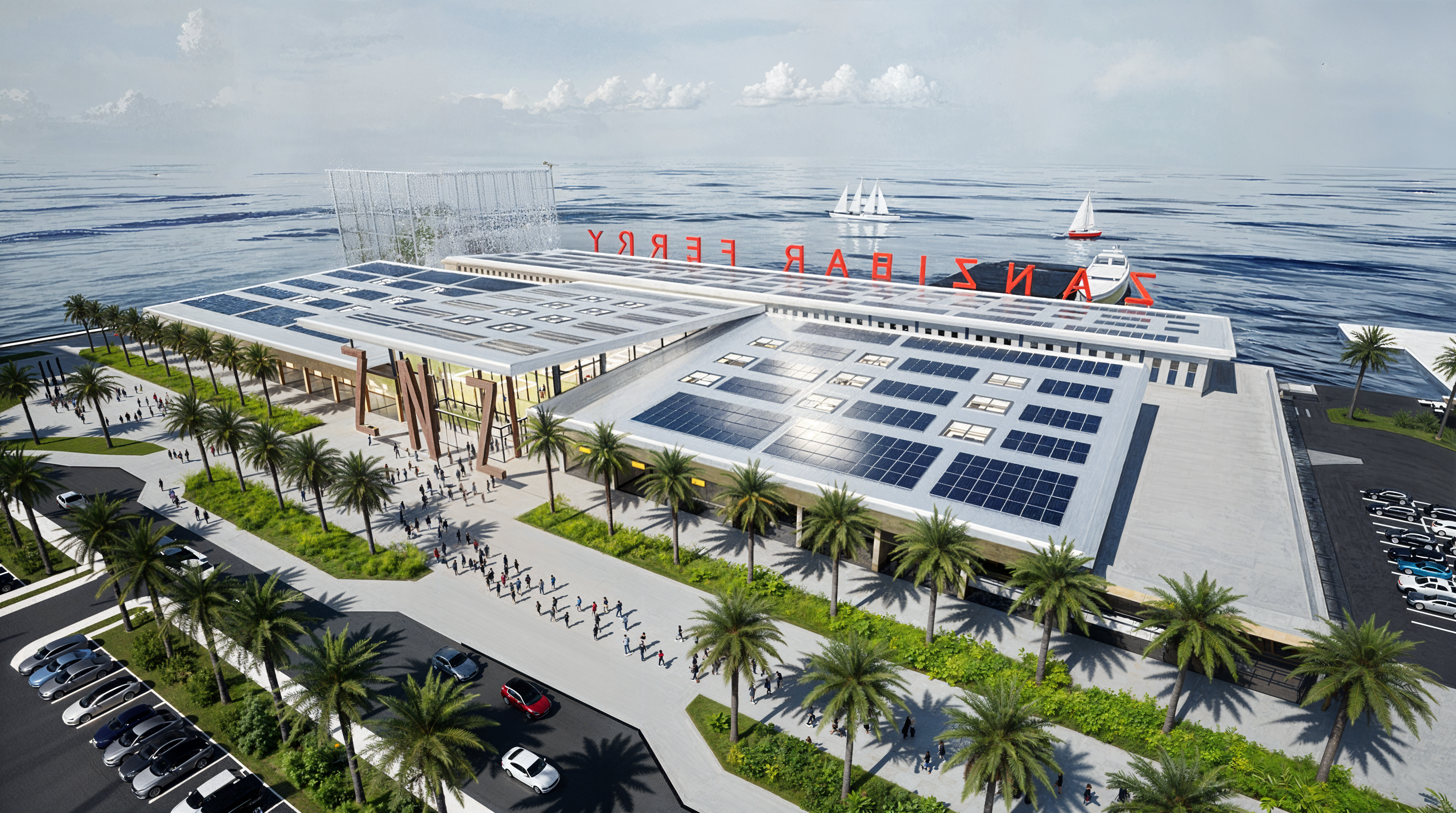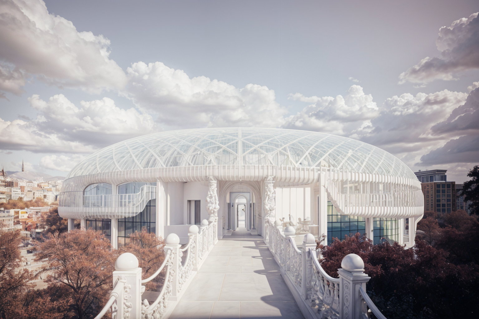 a spacious modern airport terminal the ceiling is adorned with geometric white lights casting a soft glow skylights allow daytime sunlight to flood the space with a soothing ambiance the floor is a smooth blend of soft green and grey creating a calm atmosphere people are scattered engaging in casual conversation wide windows on the upper walls feature views of a clear blue sky the walls are a neutral beige with green plants adding natural elements check in counters and departure signs add a sense of busy travel activity the overall atmosphere is vibrant and welcoming with a sense of modern architectural elegance