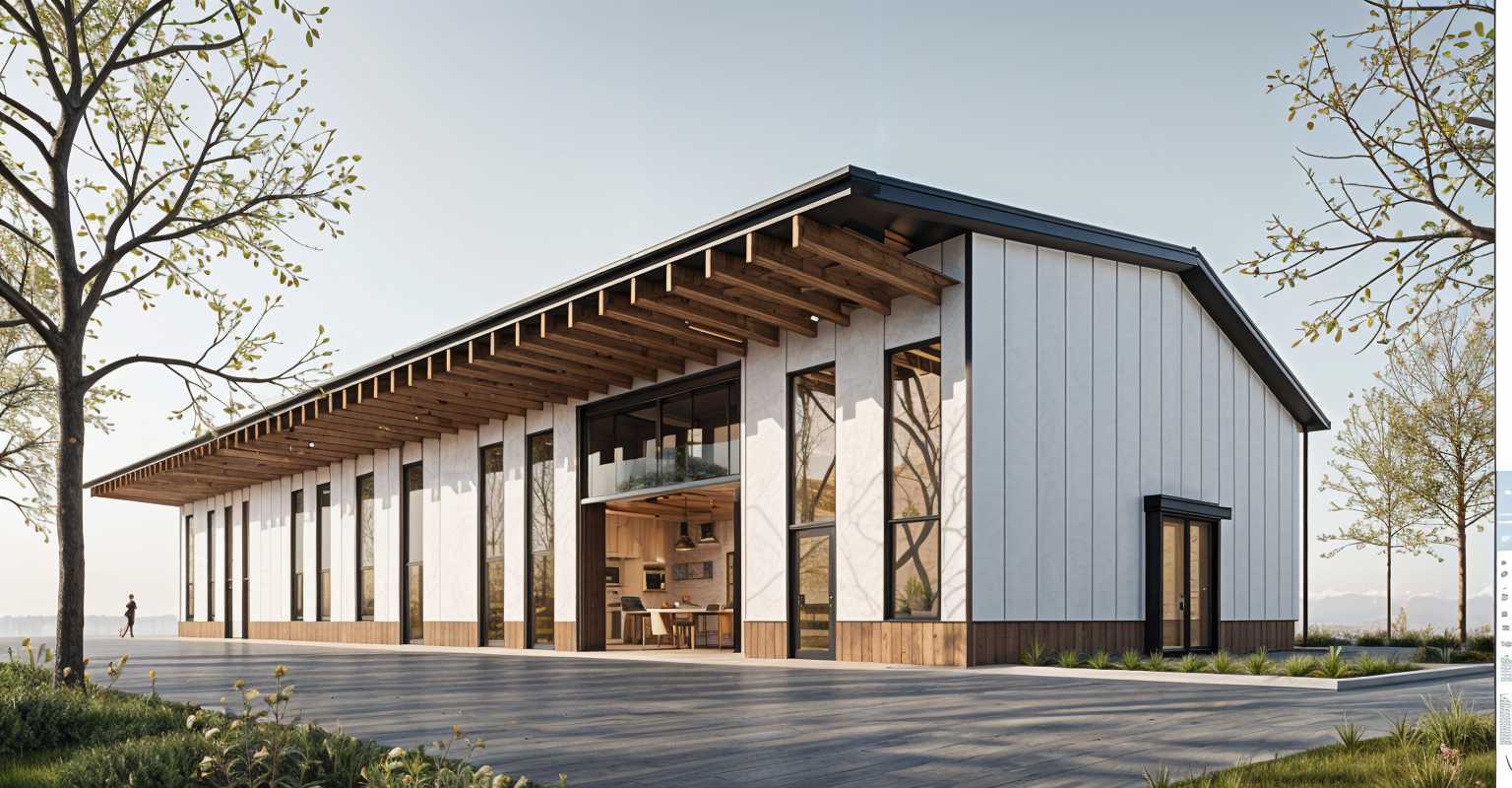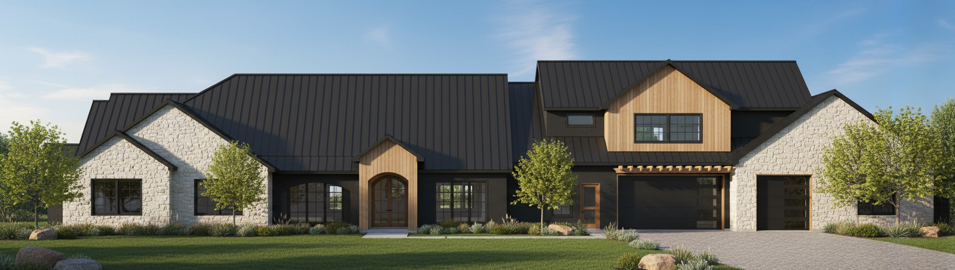 create a realistic rendering giving this home an organic modern feel adding cobblestone creamy rock natural white oak vertical and black stucco add rock on the end keep the structure the same no windows on the garage