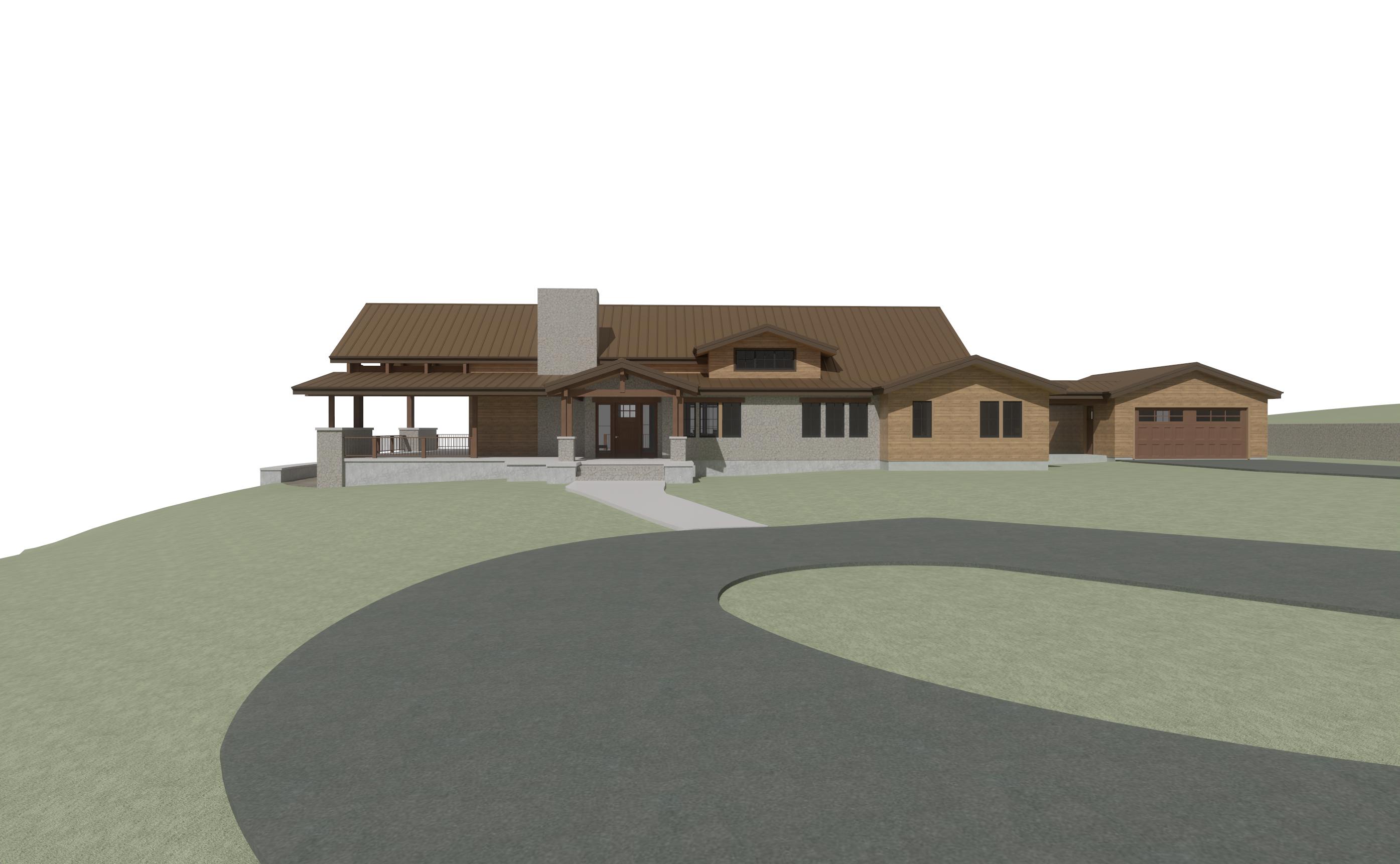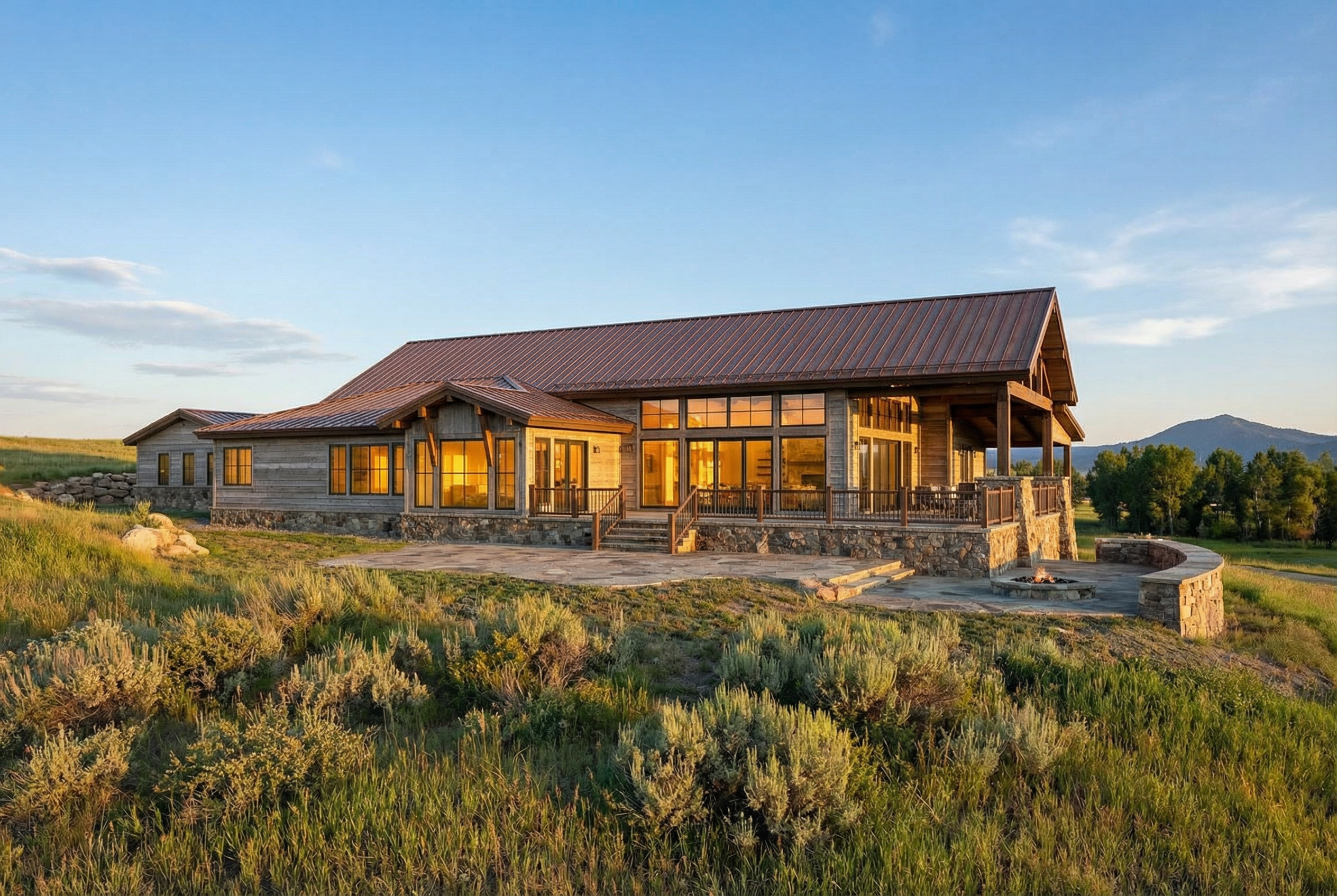 strict geometry lock prompt critical non negotiable geometry lock use the input image as a fixed reference the architecture must remain identical do not add remove or modify any elements do not change any windows or doors in any way do not replace resize move or redesign windows or doors do not add features such as fireplaces trim changes or new openings do not alter rooflines walls structure or proportions if unsure keep the original exactly as is materials texture only no design changes keep all existing materials exactly the same do not change siding types colors or locations do not replace materials do not add rock keep all siding horizontal no vertical siding only increase realism of textures depth grain shadow reflectivity material layout must remain identical to the original lighting apply realistic natural lighting and shadows photorealistic rendering quality landscaping do not touch structure add subtle realistic landscaping only around the building do not modify or interact with the structure in any way do not attach or add elements to the building final rule this is a material and lighting enhancement only zero architectural changes are allowed materials enhance only keep exact placement maintain all materials exactly as designed do not reinterpret or relocate them lap siding realistic ghost wood siding jackson hole style same locations rock on walls keep exact pattern and layout increase realism only foundation replace all visible concrete with realistic rock veneer roof new copper standing seam lighting render quality golden hour exterior lighting warm interior glow visible through windows realistic shadows depth and material texture site environment montana open field setting with native montana vegetation no trees on left no trees on right trees only far in the distance small mountain far in the distance to the right terrain right side slopes slightly upward drops off to the left the general shape of the green shown is correct hardscape keep design intent exact foundation walls should show rock only no exposed concrete final instruction enhance realism only do not redesign reinterpret or adjust any architectural elements preserve the exact structure window and door sizes and overall proportions