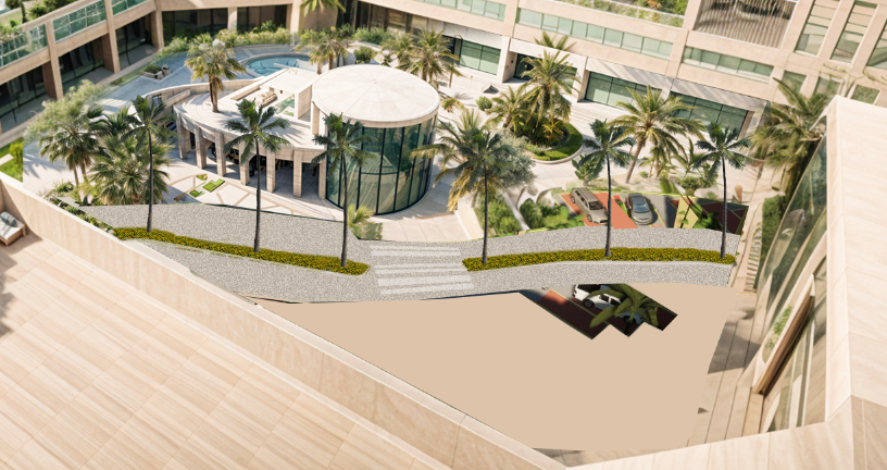 modern urban plaza with a road and palm trees beige stone day view architecture