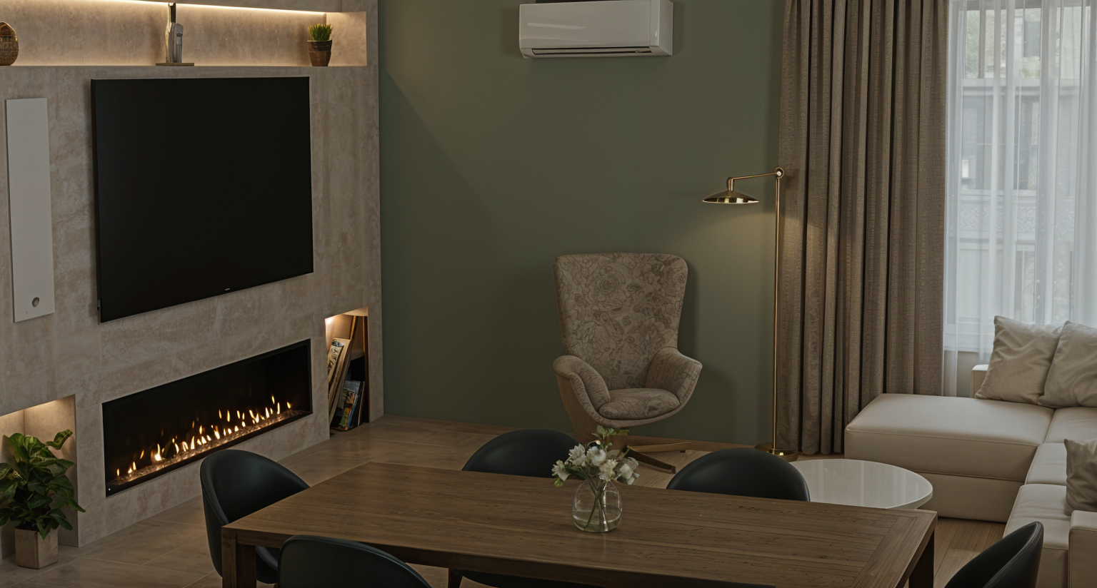 interior shot add blue floral wallpaper up top place round seating with tree in middle instead of round table