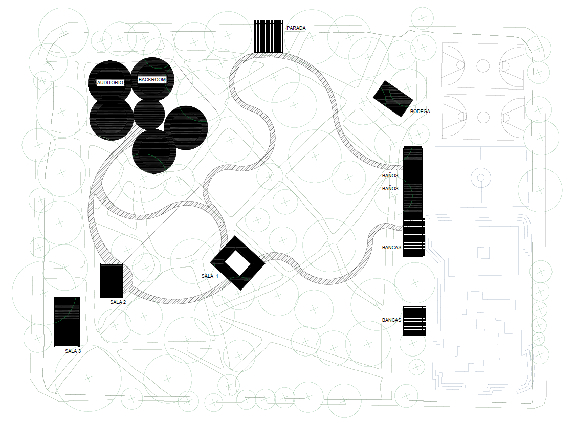 make this park layout a real life scene seen from above add a bunch of tall trees and the black squares make them structures of wood seen from the top and the circles make them wood funnel structures make the curves an elevated wood walk way put 2 basketball courts and one soccer field on the right as well as children colorful exterior games on the irregular shape