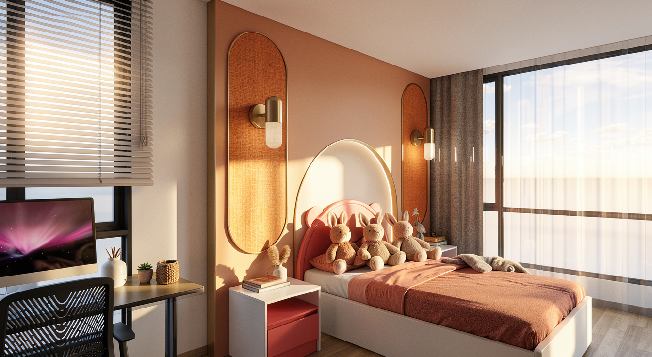 add 3 stuffed sanrio toys on the bed add some simple accessories on the two bedside tables
