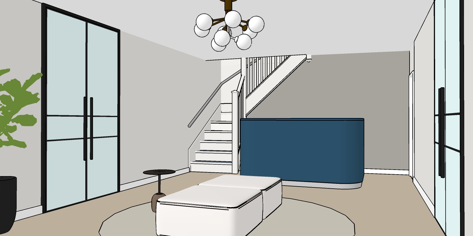 keep stairs and balustrade same colour as the walls blue tiled reception desk with plinth led light back wall behind reception desk to be reeded walnut glass frosted doors wooden flooring with beige woven round rug ottoman upholstered in a boucle farbic