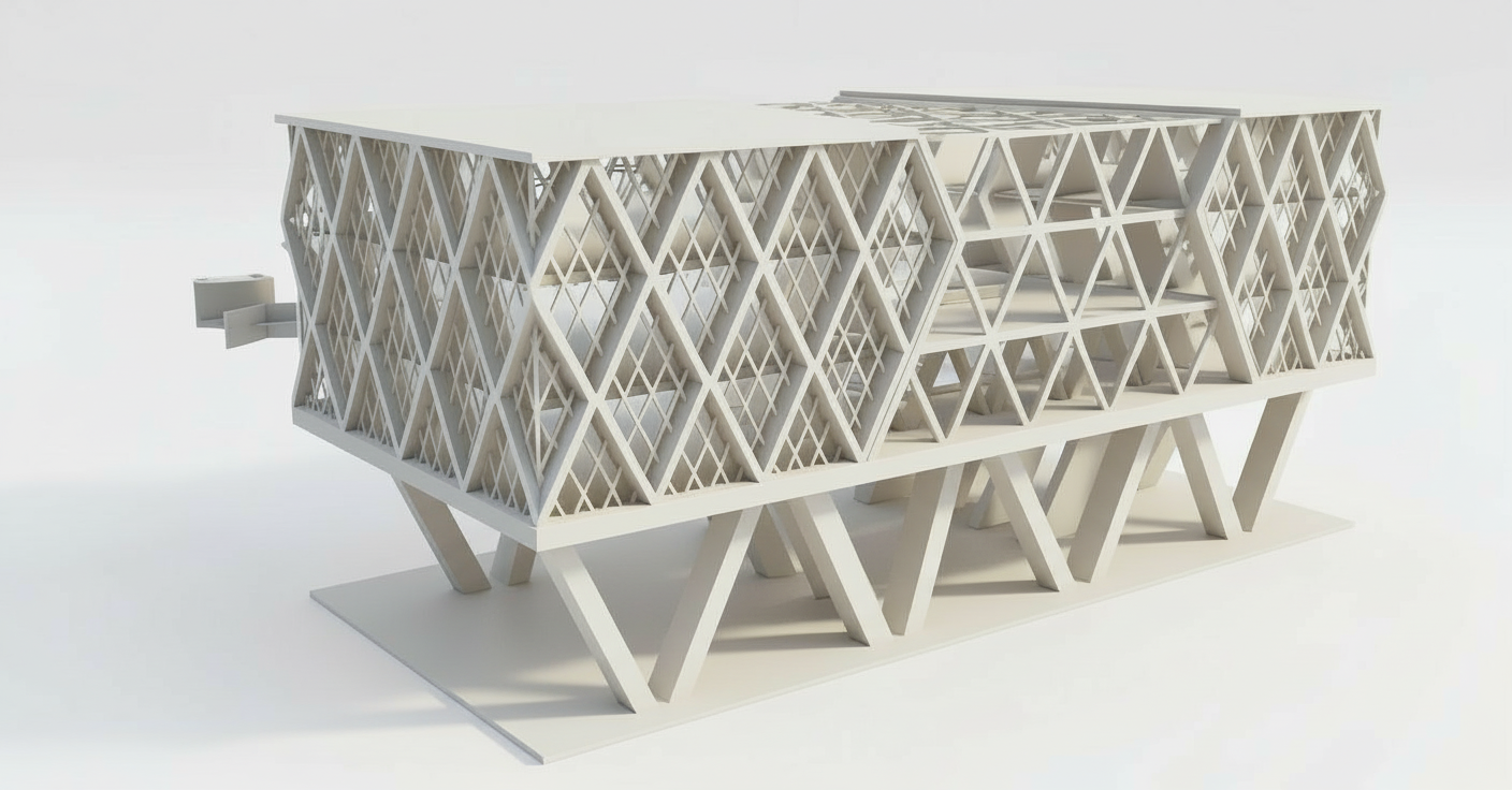 preserve the exact building geometry further reduce the number of ground level supports so only a few primary structural v shaped elements remain introduce hierarchy some supports should be thicker and more dominant acting as primary load bearing elements while others are lighter and secondary align all supports clearly with major diagrid nodes or structural intersections above so they read as directly carrying load emphasize the horizontal transfer band at the first floor so it clearly distributes loads to the supports below maintain a clean architectural clay render with strong structural clarity and no additional elements